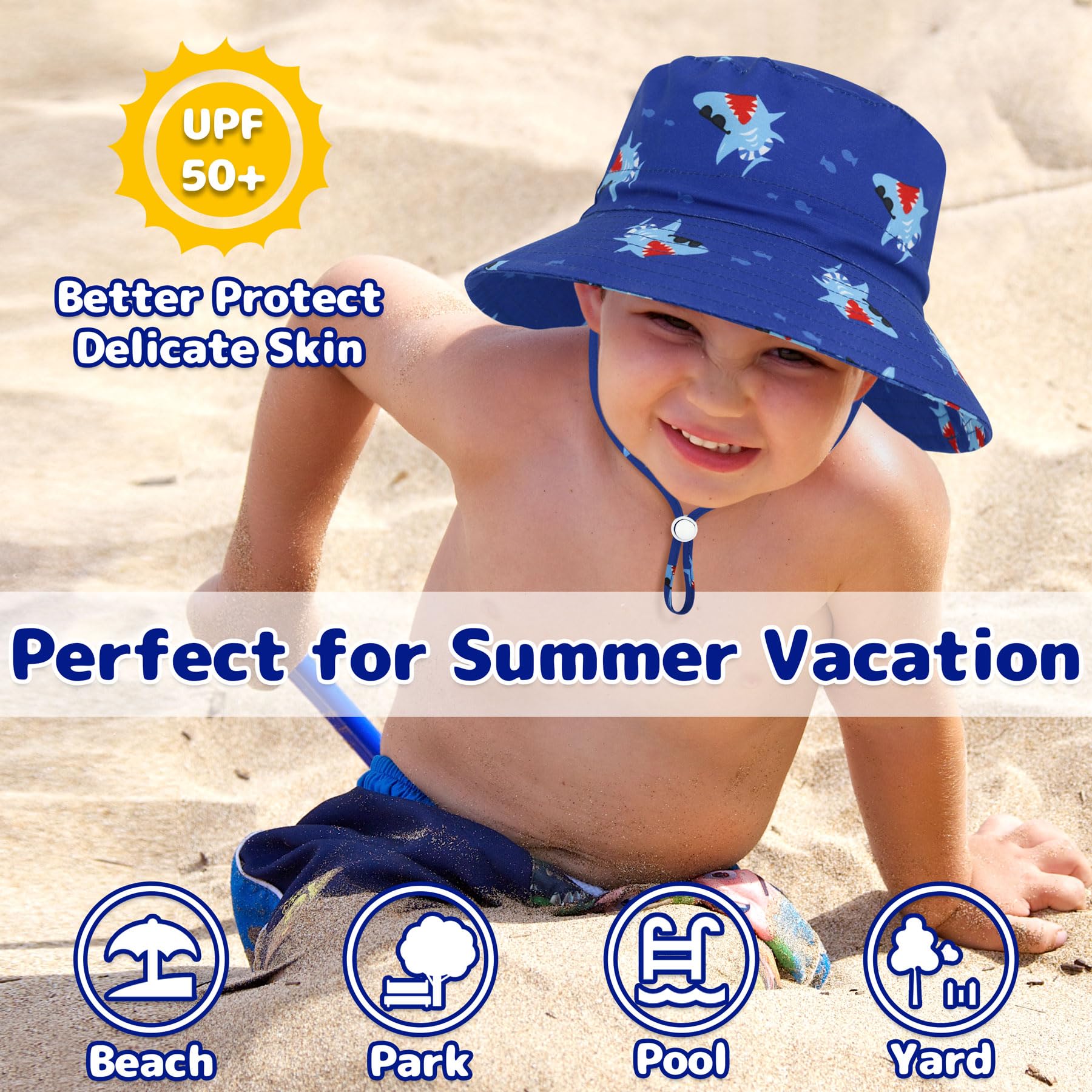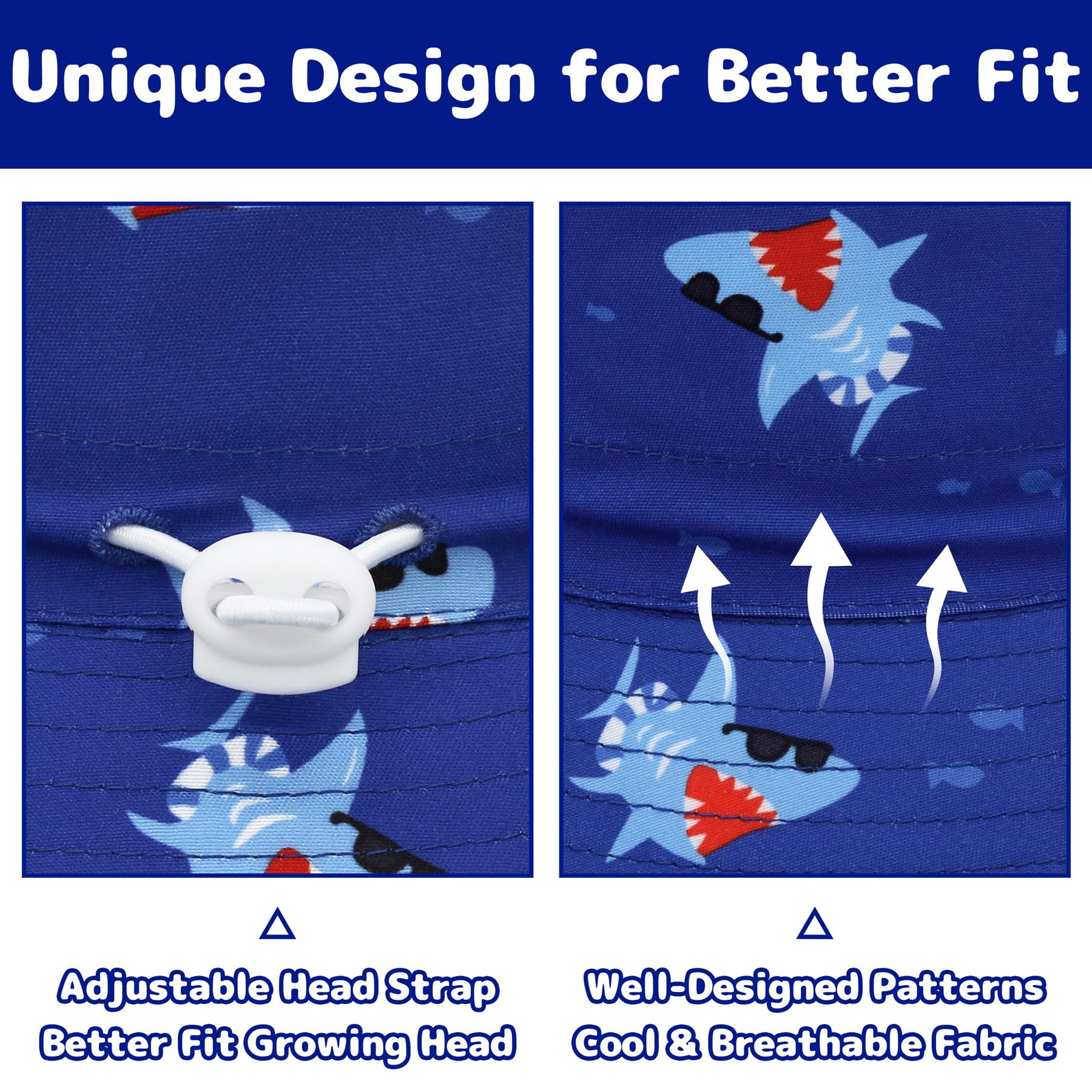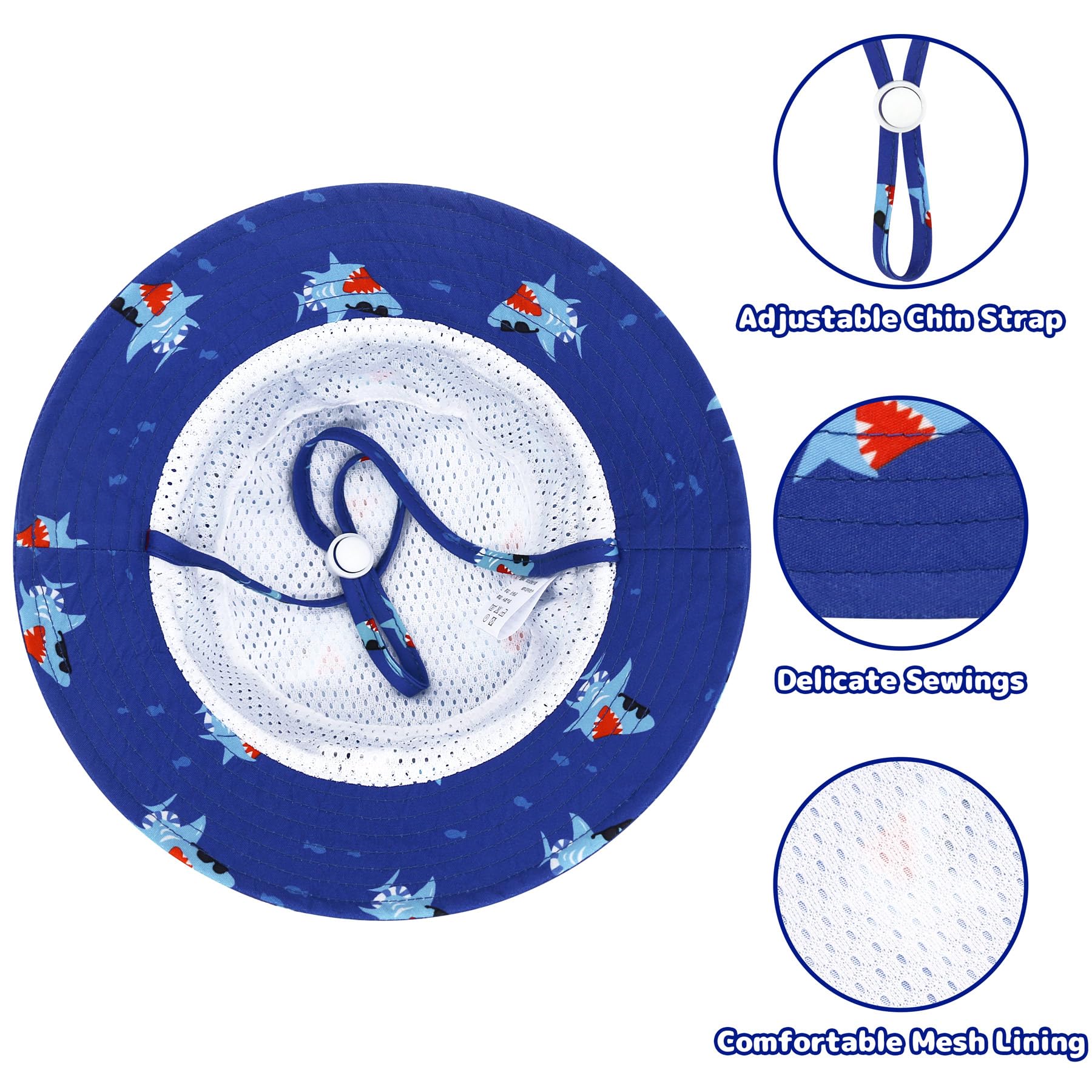 - Q: How does the adjustable strap work on the baby bucket hat? A: The baby bucket hat features an adjustable head strap that allows you to customize the fit for your baby's head circumference and a chin strap to keep the hat securely in place.
