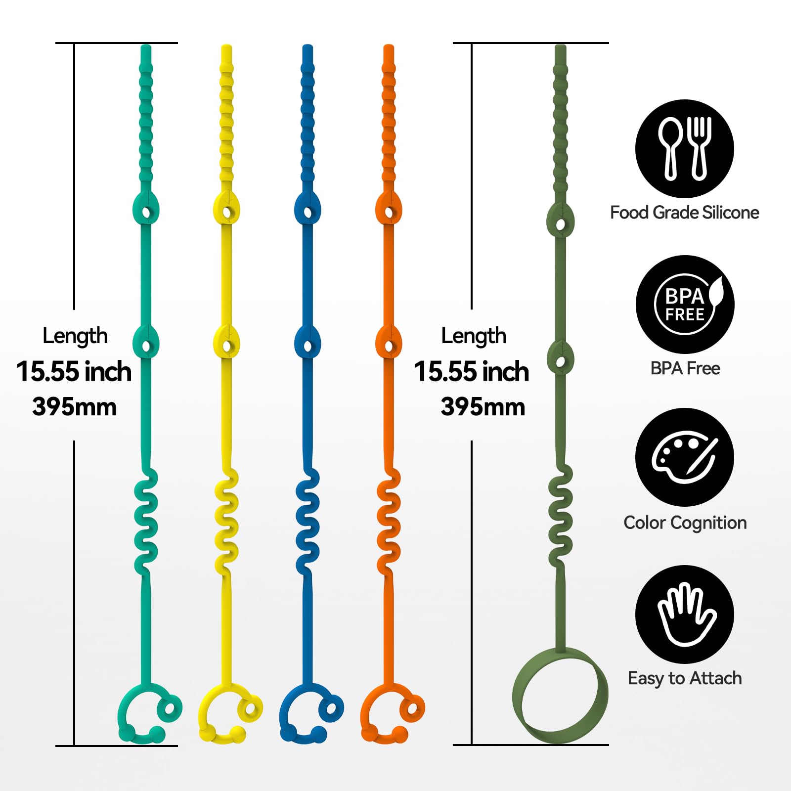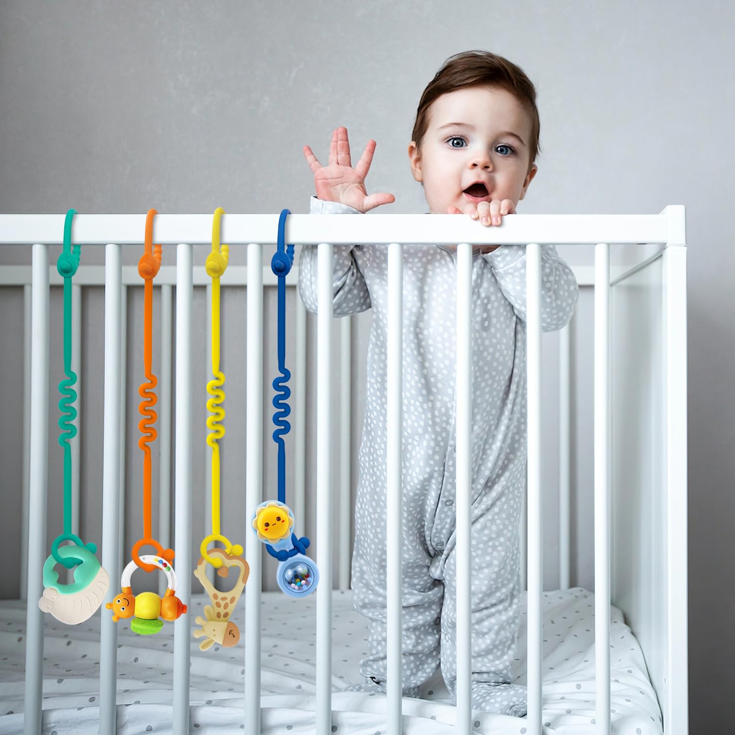 • Q: What is the material used in these toy straps? A: The toy straps are made from 100% food-grade silicone, ensuring they are safe for your baby while being durable and flexible.