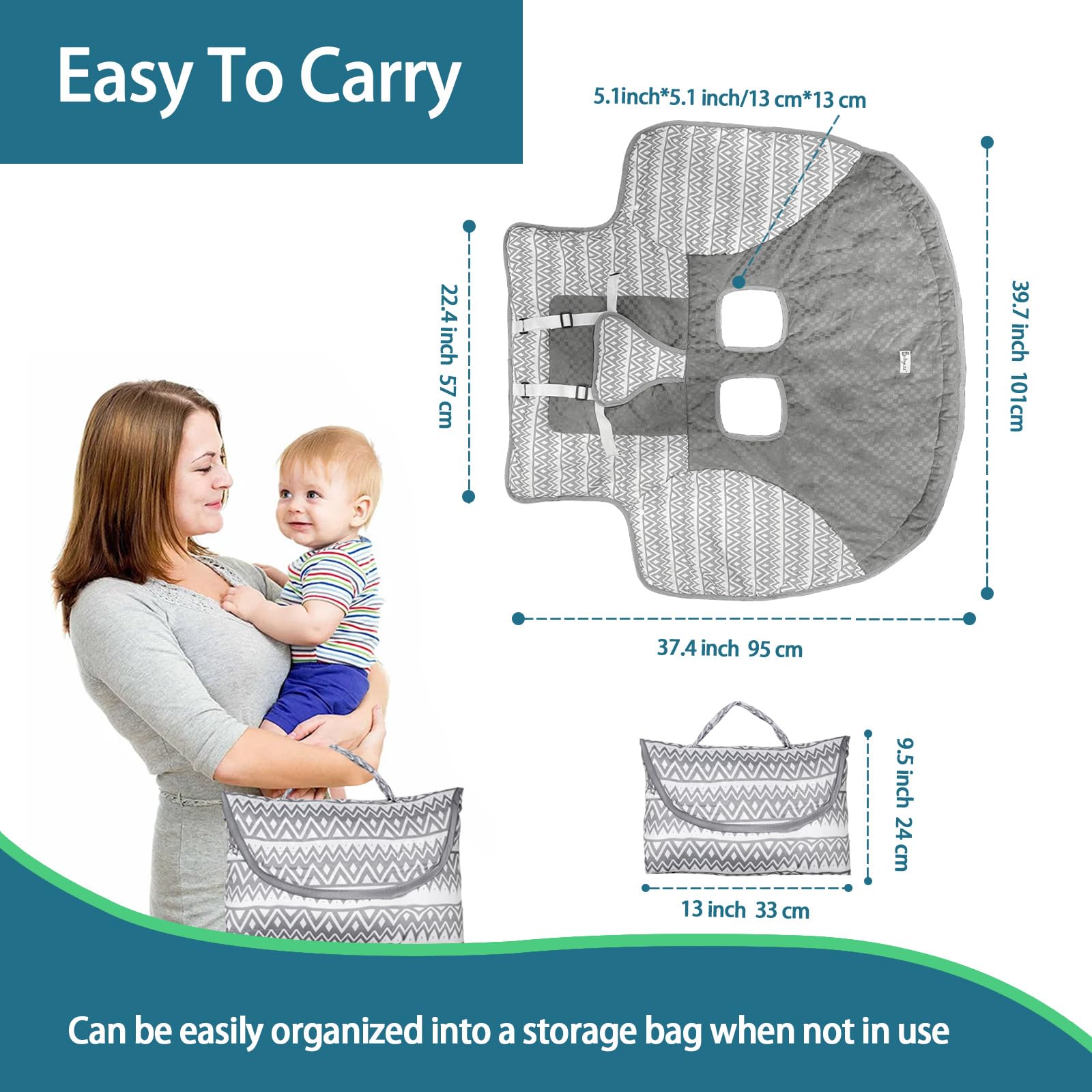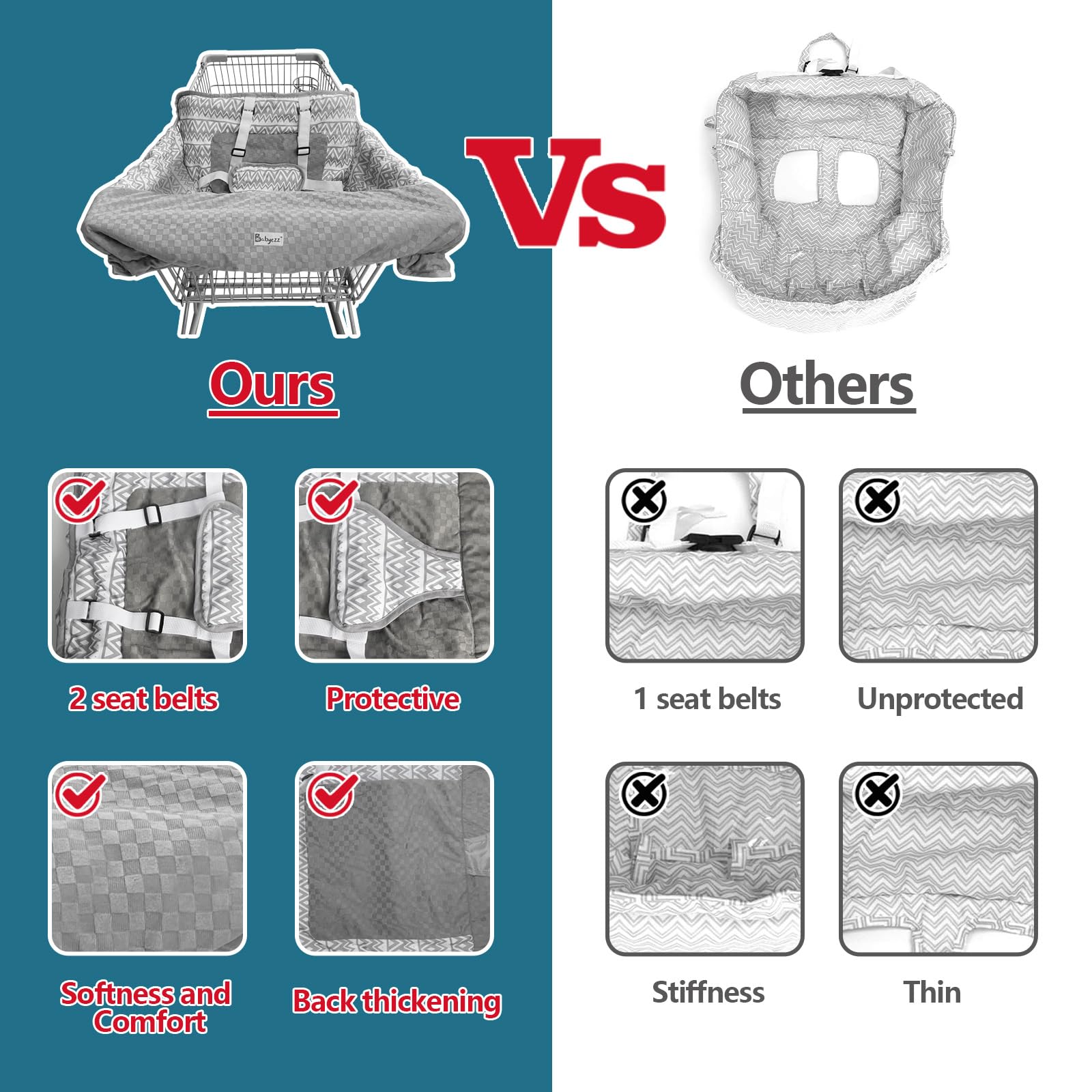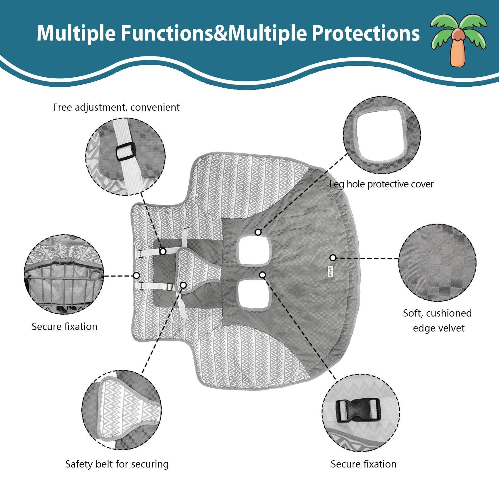 - Q: Does the cover provide safety features for my baby? A: Absolutely. The cover includes an adjustable seat belt to fit your baby's size and comfort, preventing their legs from contacting the shopping cart's metal surface.