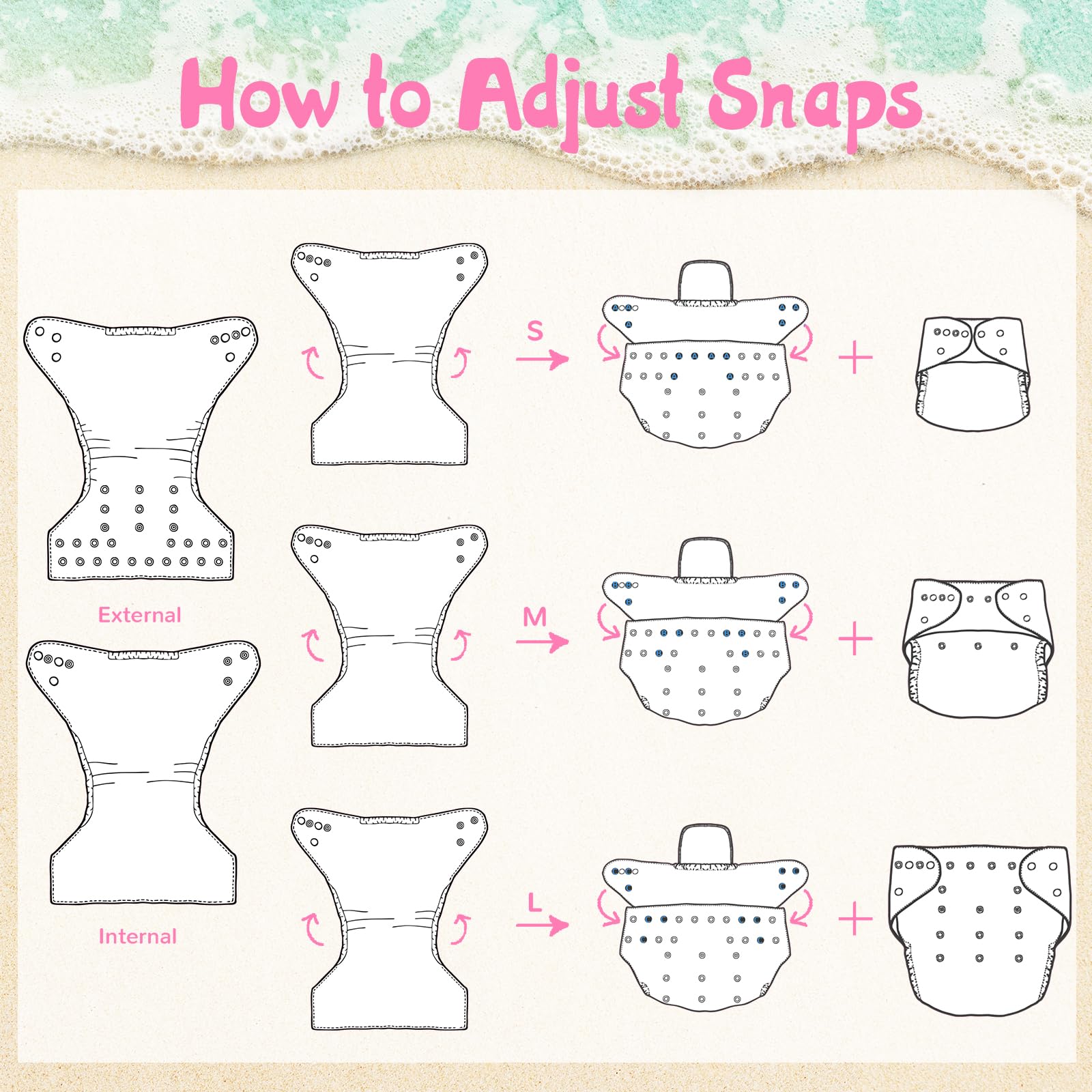 - Q: How do I adjust the fit of the swim diapers? A: The swim diapers feature adjustable snaps at the front, allowing you to customize the fit as your baby grows.