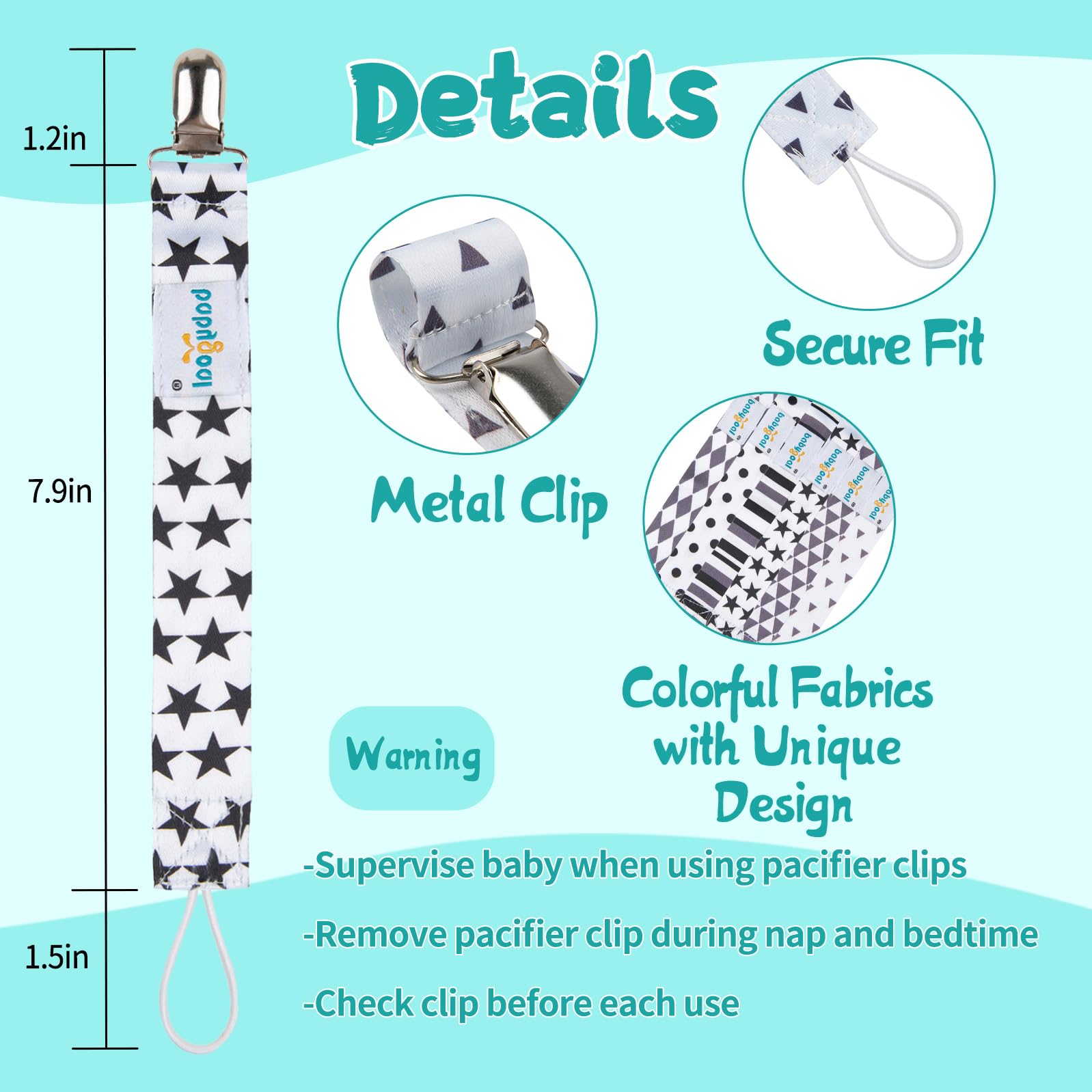 - Q: How do I attach the pacifier clips to my baby's clothes? A: The pacifier clips have a secure clasp that easily attaches to your baby's clothes, keeping the pacifier clean and close.