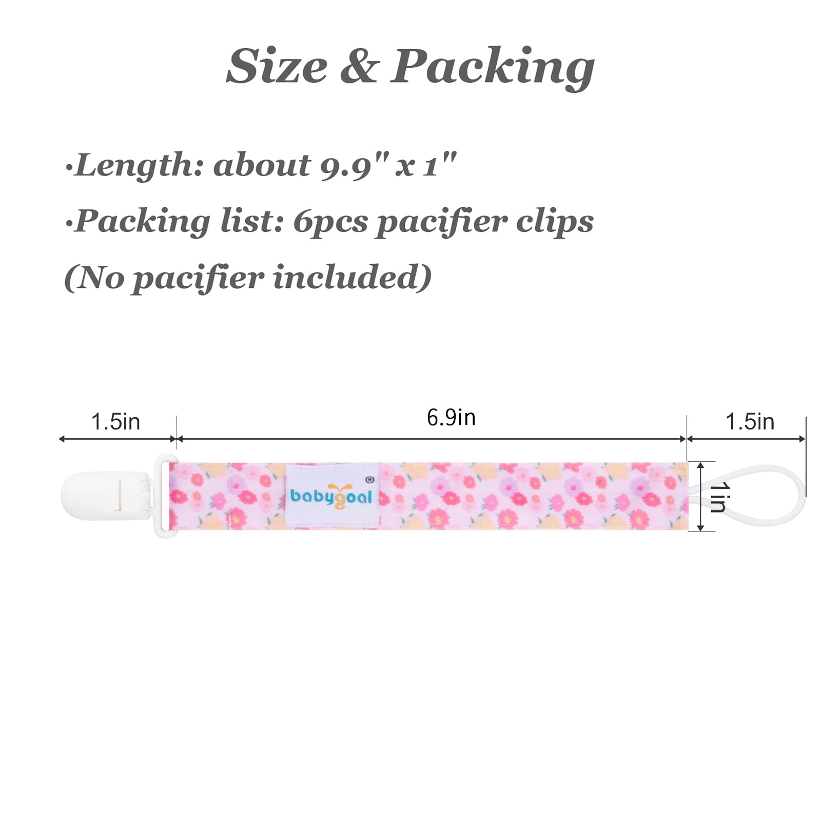 - Q: How many clips are included in the pack? A: Each pack contains six Babygoal Pacifier Clips, providing multiple options for use with different pacifiers or toys.