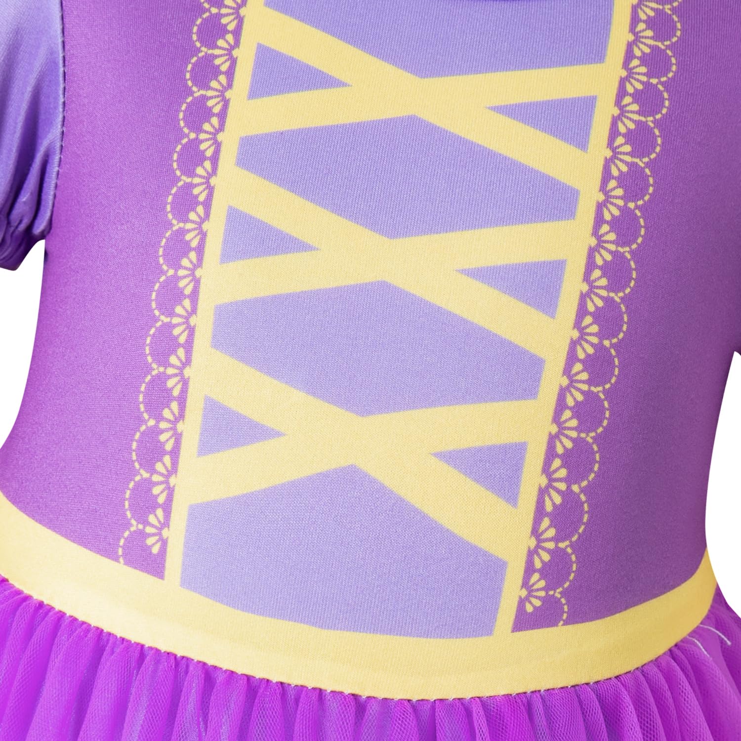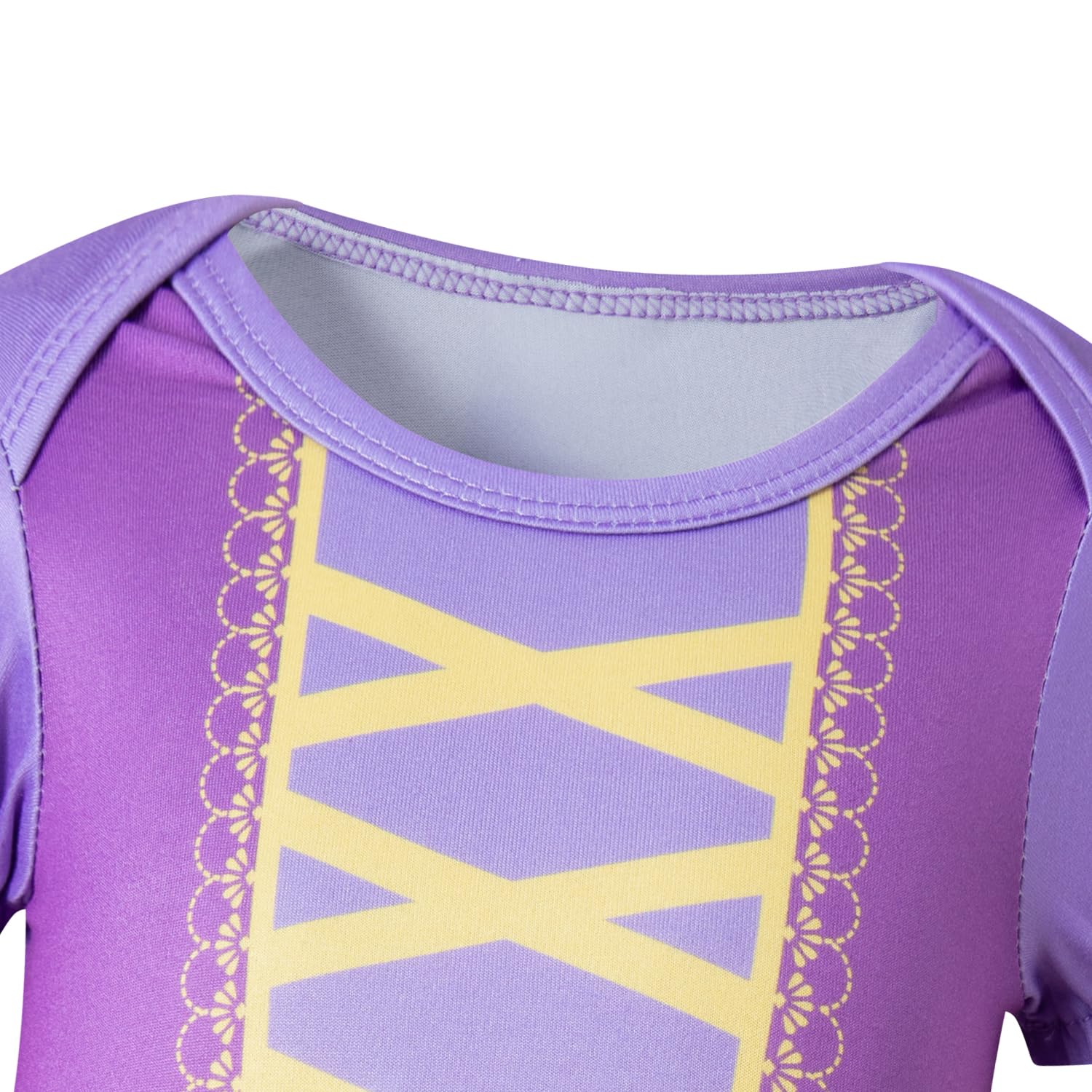 - Q: What style does the costume feature? A: The costume features a short sleeve design with a round neck and a classic pattern, along with a purple hemline that embellishes the waist.