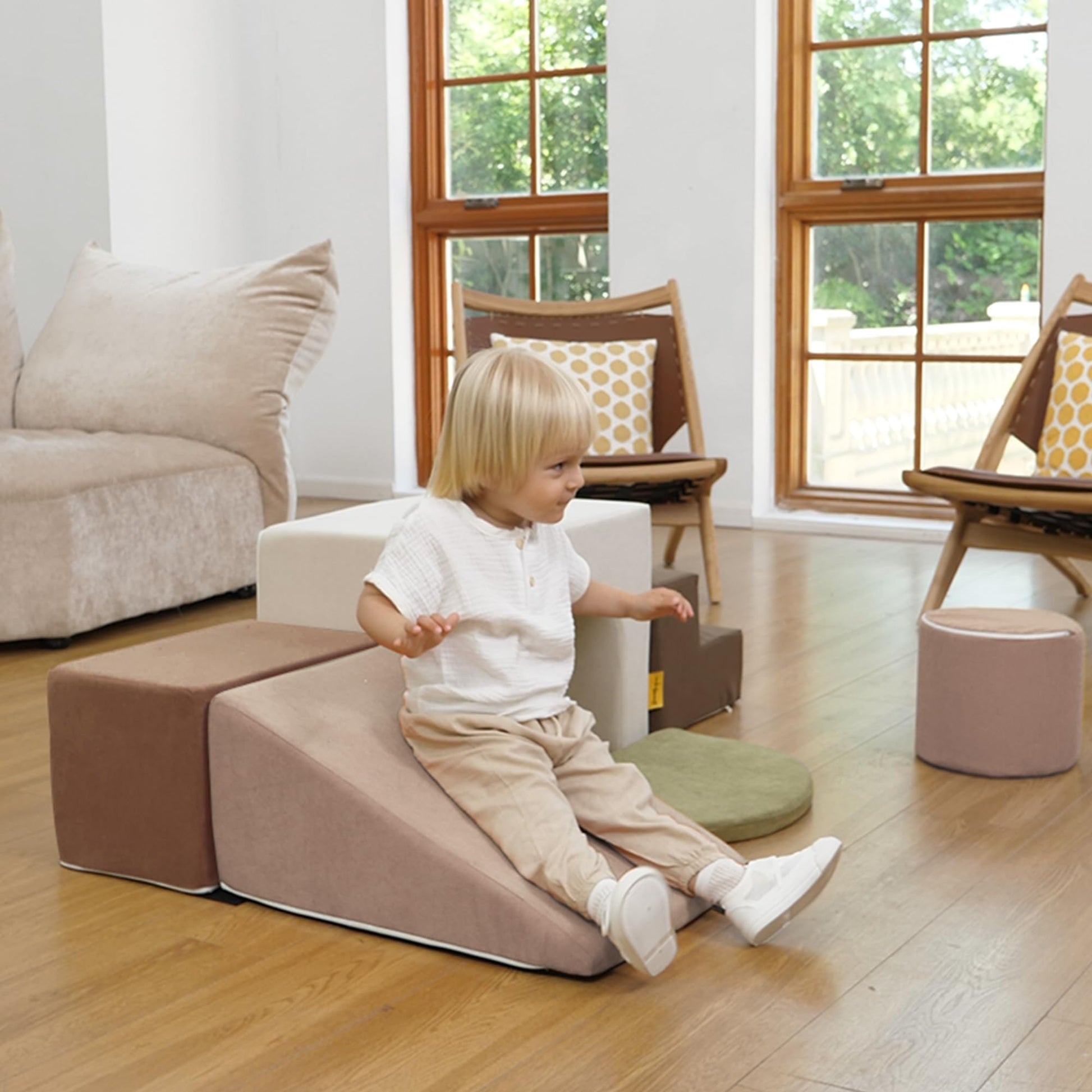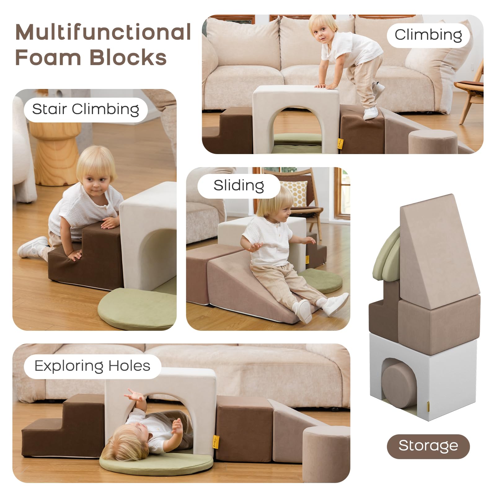 Boost Physical Coordination and Imagination: Featuring 7 versatile foam climbing blocks, this set encourages activities such as climbing, crawling, sliding, and building. It aids in the development of motor skills, physical coordination, and creative play, making it a fantastic addition to any child's playroom | High-Quality, Child-Safe Materials: Made with high-density foam for excellent support, these blocks are covered in a soft, skin-friendly fabric with soothing colors. This combination ensures a safe, sensory-friendly experience, perfect for young children | Non-Slip Design and Child-Proof Zipper: The bottom of each block is designed to prevent slipping on hard floors, ensuring a secure play environment. The hidden zipper design keeps small parts out of reach, preventing accidental ingestion and enhancing safety | Durable and Easy to Maintain: Crafted from robust, waterproof fabric, these foam blocks are built to last and easy to clean. The blocks can be disassembled quickly with zippers, making washing simple and convenient | Compact Storage and No Assembly Required: Delivered in a vacuum-compressed package for environmentally friendly shipping, these blocks require no assembly and regain their full shape within 48 hours. They can be easily stored in a corner, keeping your space tidy and organized