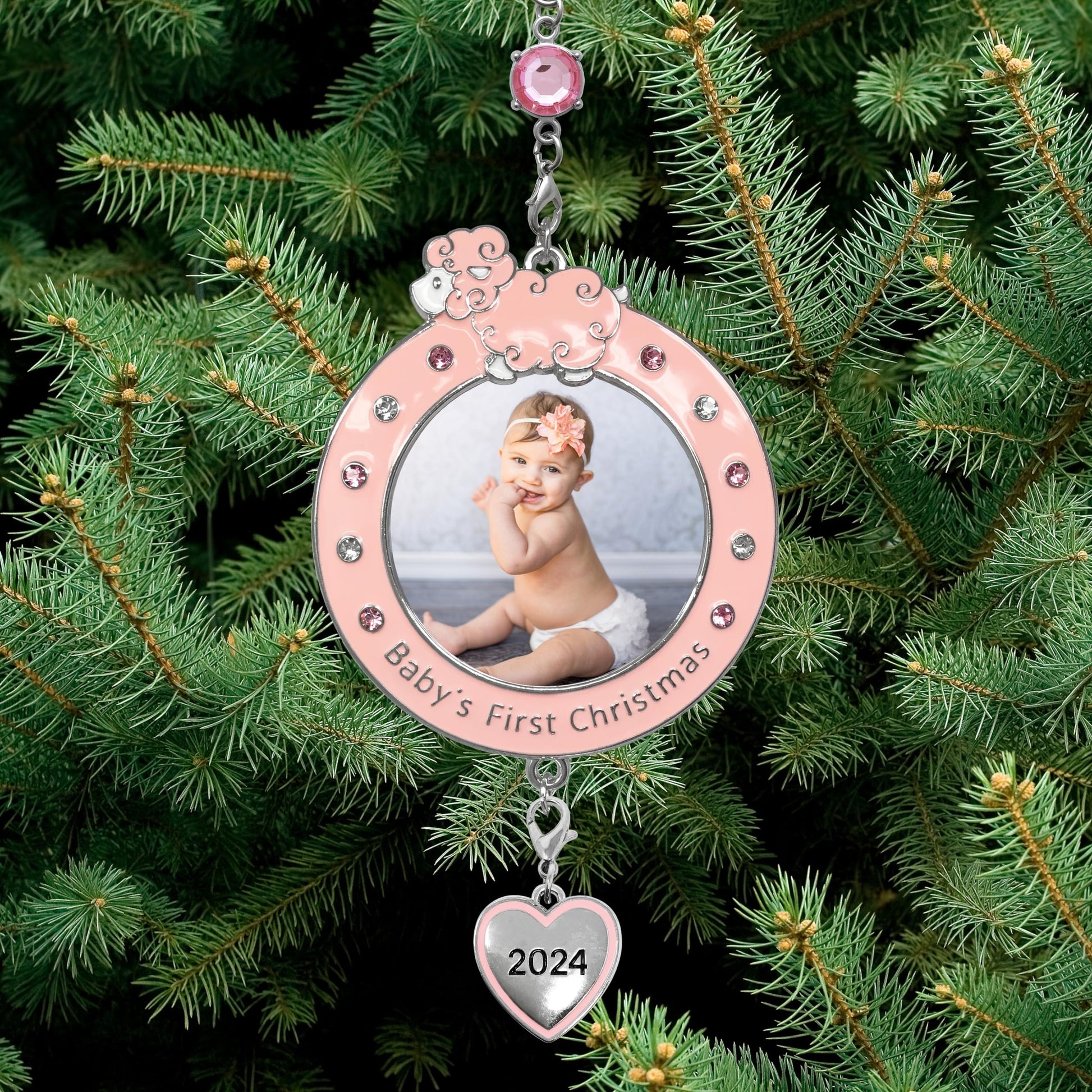 - Q: What does the ornament feature? A: The ornament features the phrase 'Baby's First Christmas' along the bottom of the frame, and it has a removable 2025 charm hanging below.