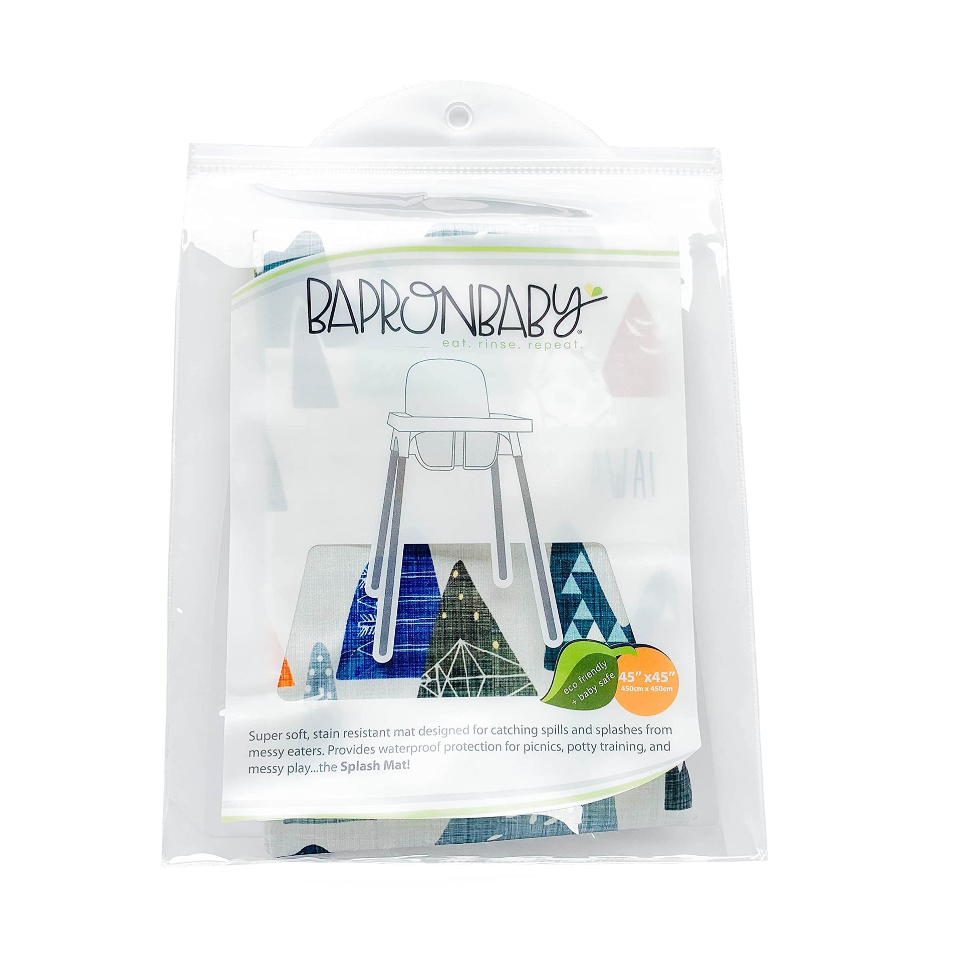 This lightweight, waterproof mat is 45' in diameter and is designed to catch spills and splashes. Ideal for: - Under the high chair - Indoor/Outdoor Picnics - Potty Training/Waterproof nap pad - Crafts and sensory play - Under OR on top of tables for crafts and activities BapronBaby's unique waterproof fabric is stain resistant, and machine washable. Three cheers for no more scraping dried juice spots off the tile and scrubbing oatmeal out of the carpet! This mat weighs less than 8oz. and folds up to the size of a small book for easy transport. Details: Splash Mat dimensions: 45' x 45' with rounded edges.