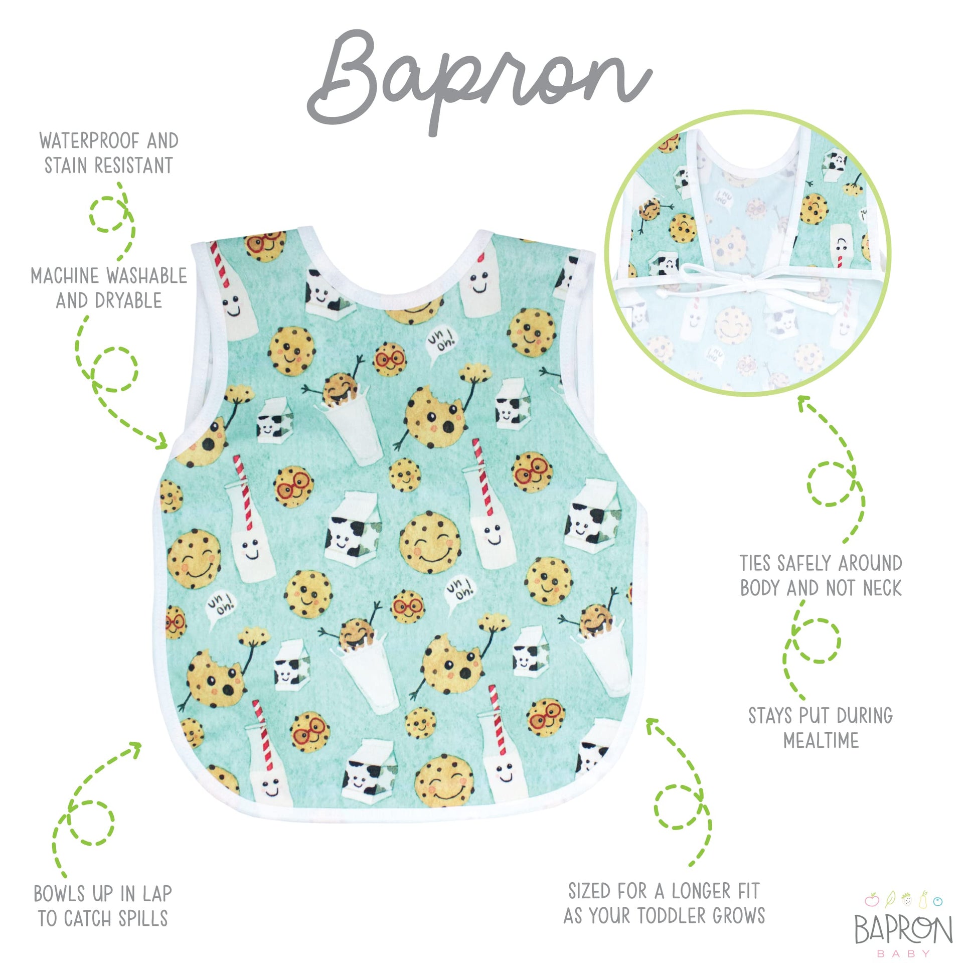 - Q: What age range is the BapronBaby Cookies & Milk Bapron suitable for? A: The Bapron is suitable for children aged 6 months to 3 years, and there's a separate Preschool Bapron that fits children from 3 to 5 years.
