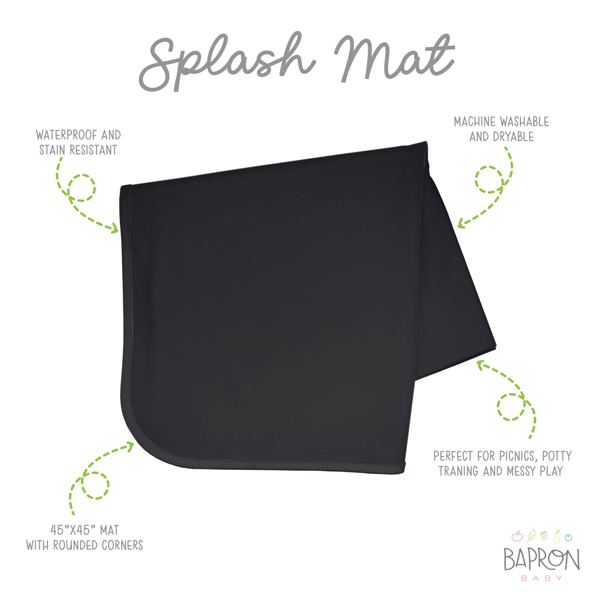 - Q: What are the dimensions of the BapronBaby Minimalist Black Splash Mat? A: The BapronBaby Minimalist Black Splash Mat measures 45 inches in diameter.
