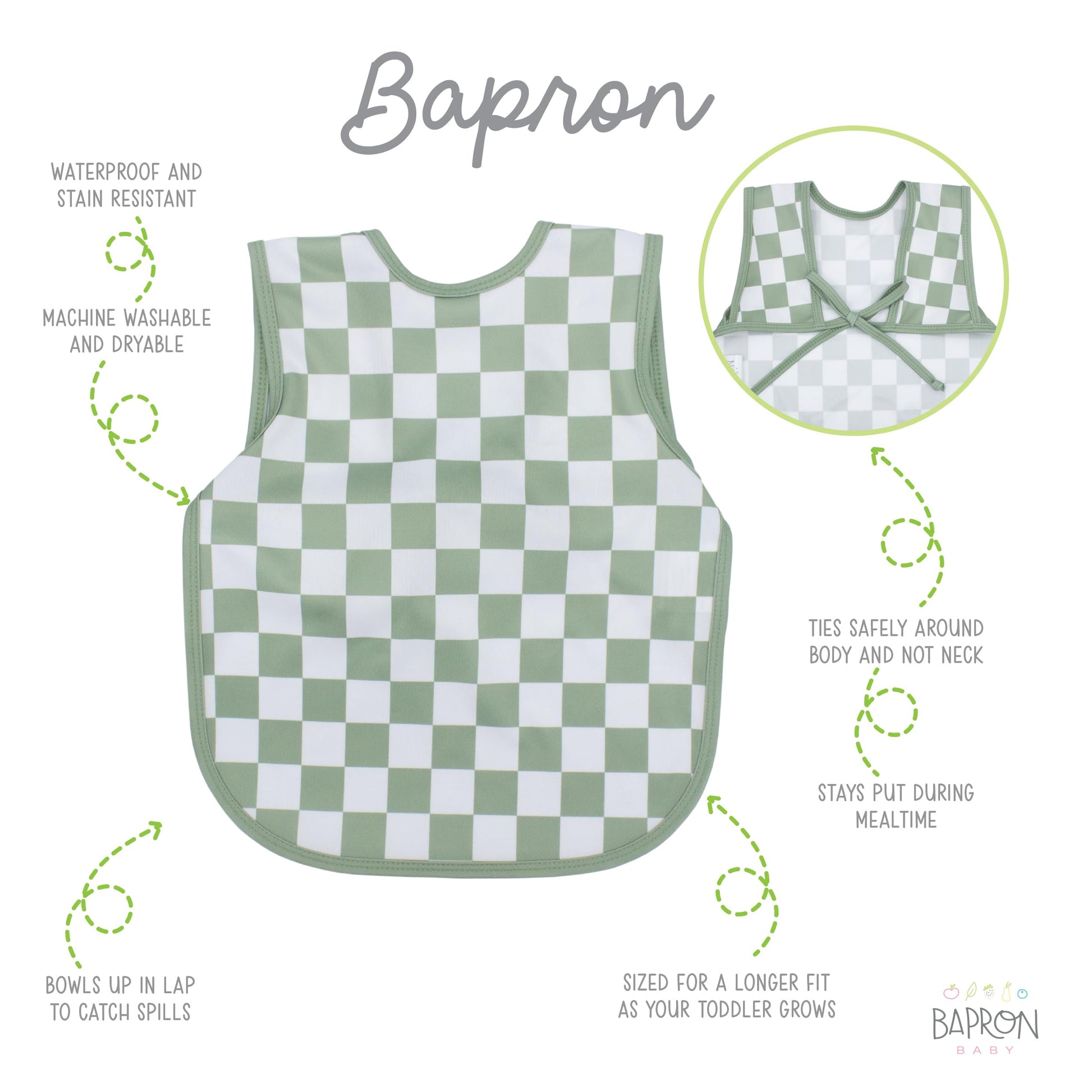 - Q: What age range is the BapronBaby Sage Checkerboard Bapron suitable for? A: This Bapron is designed for preschoolers aged 3 to 5 years, making it a great choice for little ones who are transitioning from toddlerhood.