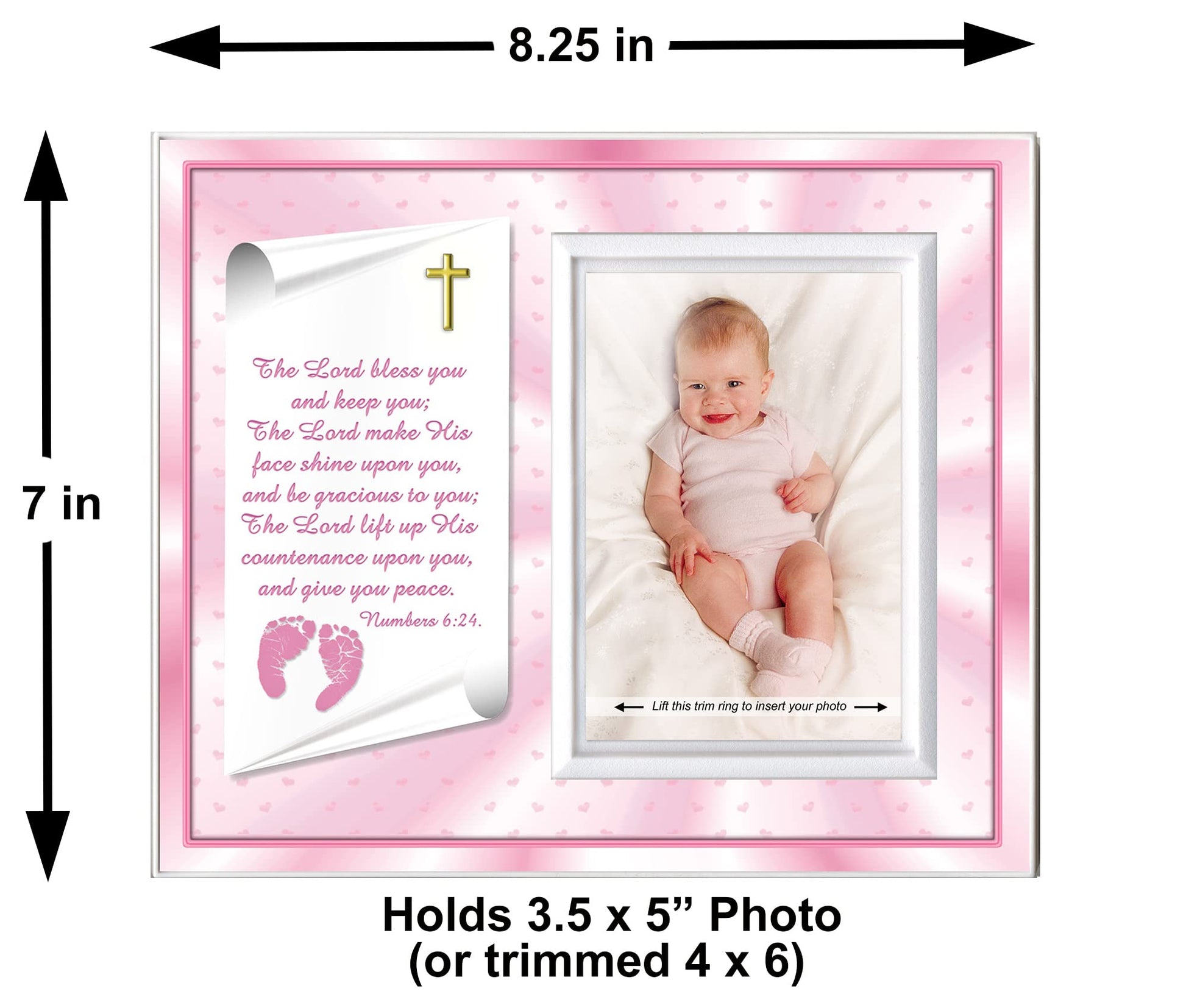 - Q: What is the size of the Baptism Christening picture frame? A: The frame measures 8.25 inches by 7 inches and holds a photo sized 3.5 inches by 5 inches or a trimmed 4 inches by 6 inches.