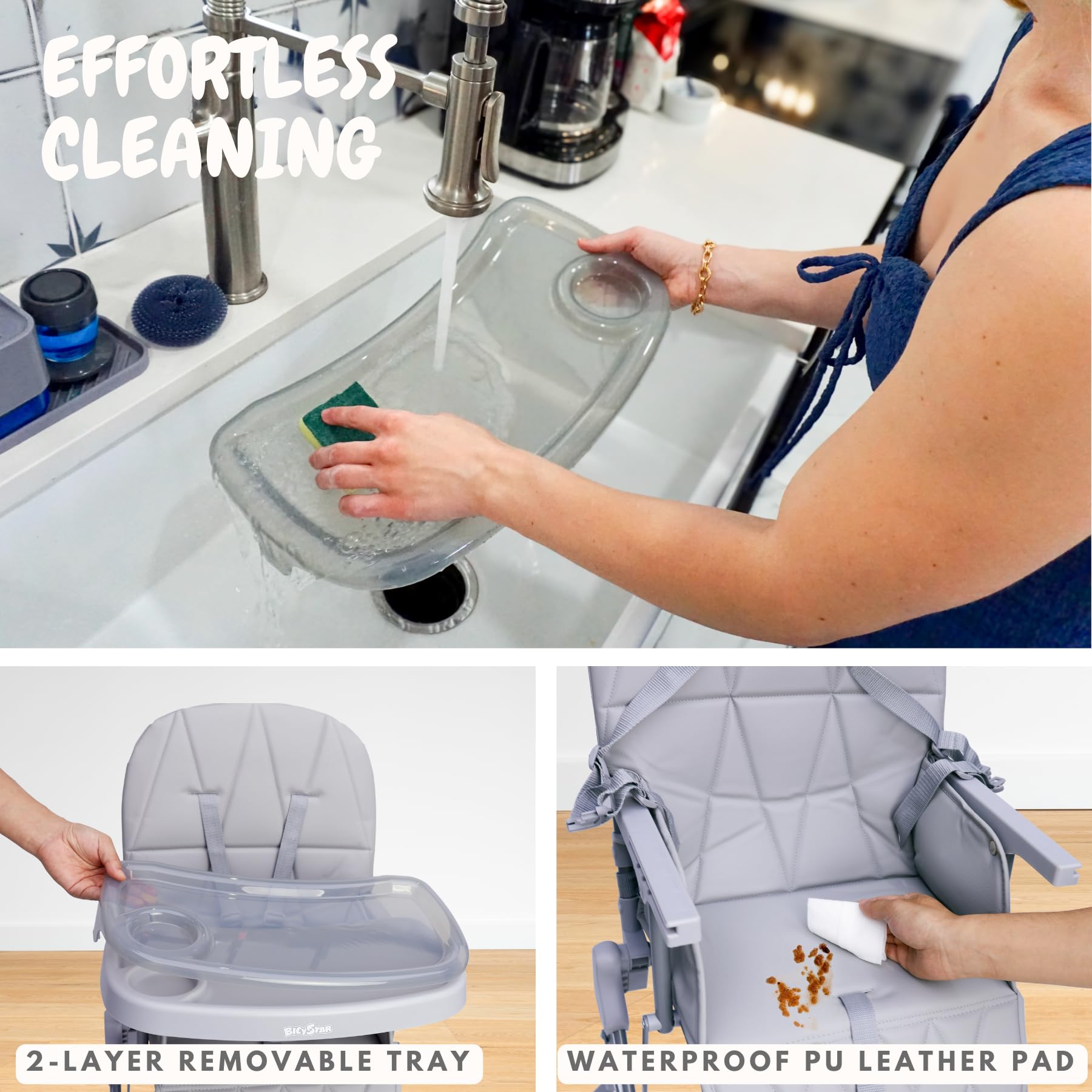 - Q: How do I clean the high chair? A: Cleaning the high chair is easy due to its wipeable waterproof PU leather seat pad and the 2-layer removable tray, which can be quickly wiped down or removed for thorough cleaning.