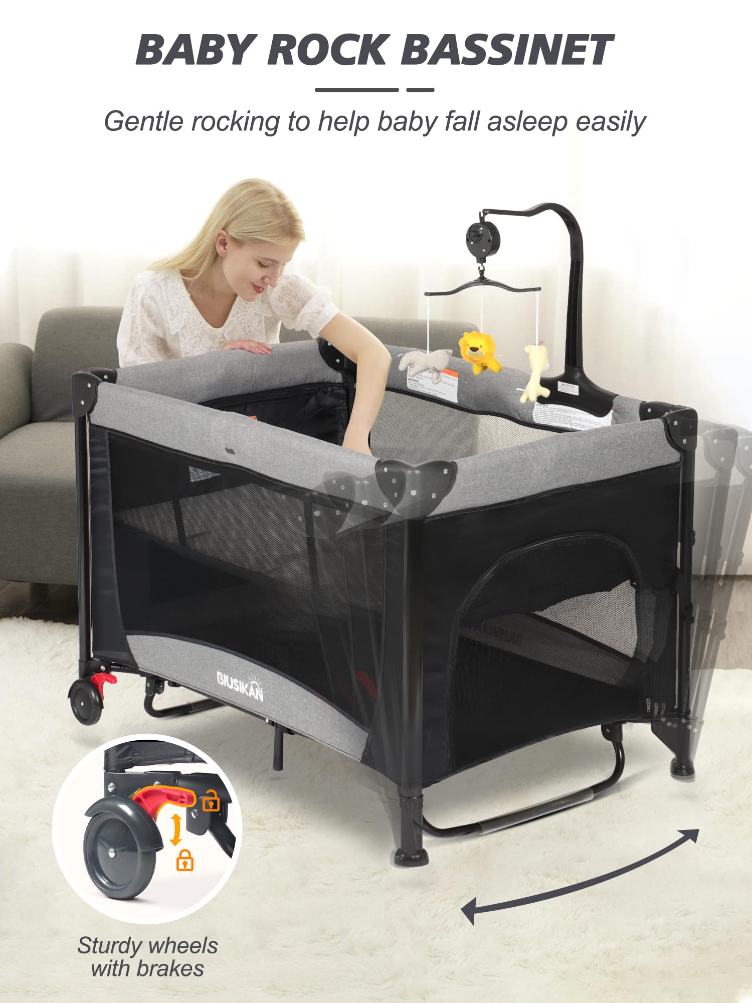 - Q: What is the BIUSIKAN Baby Bassinet's main purpose? A: The BIUSIKAN Baby Bassinet serves multiple functions, including a crib, bedside sleeper, rocking bassinet, playard, and changing table, making it ideal for a baby's sleep and play needs.
