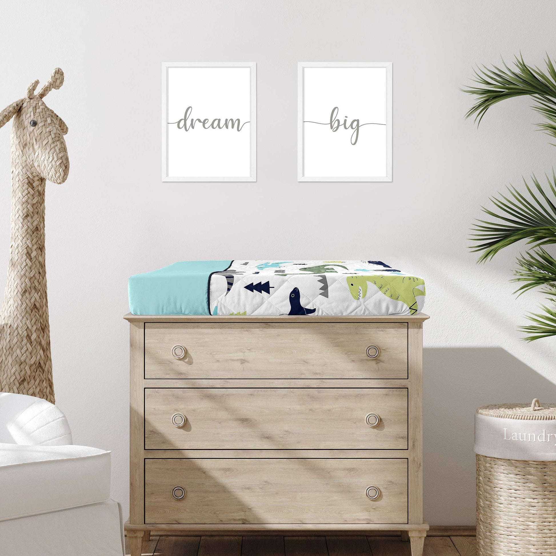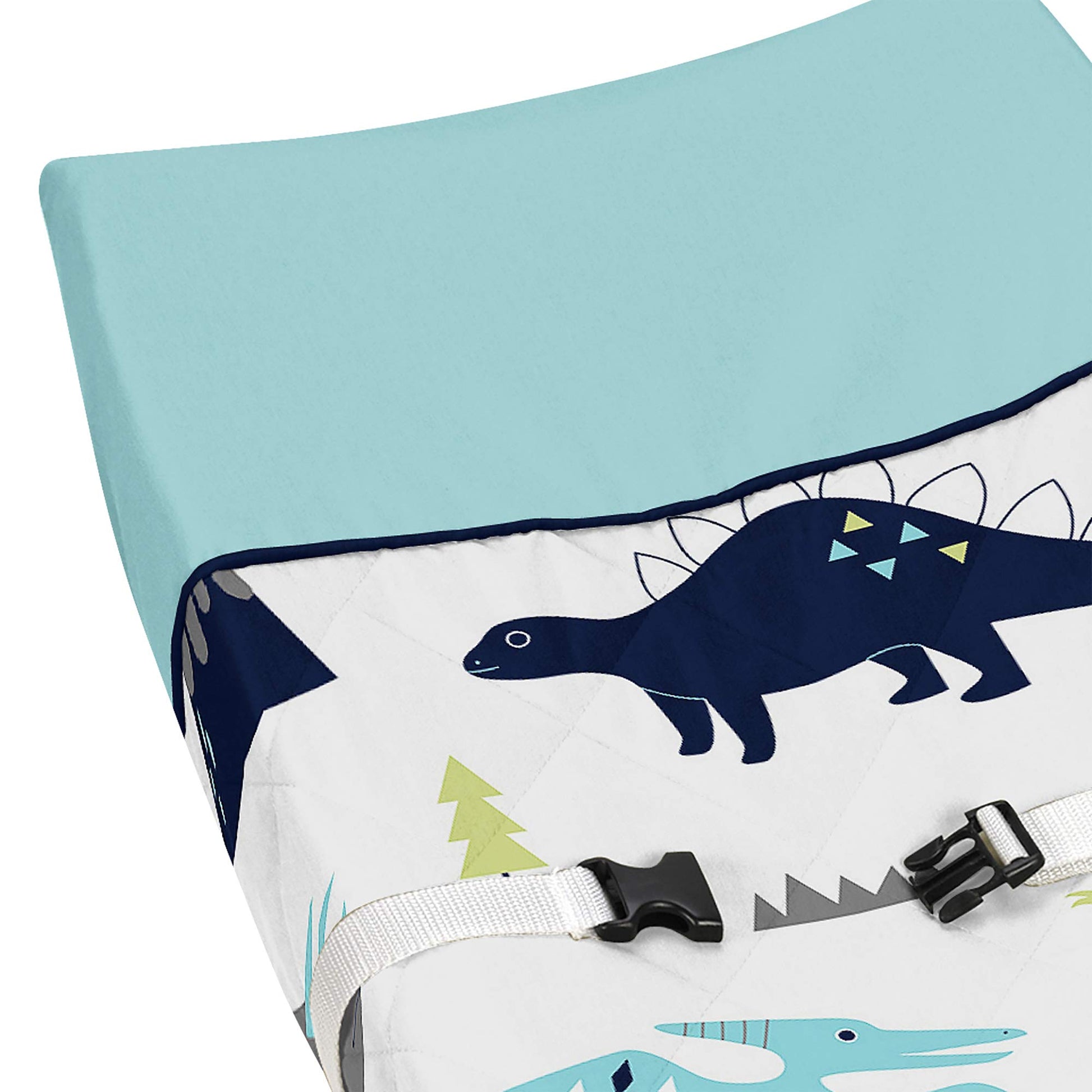 - Q: What is the design of the changing pad cover? A: The design features modern boho mod dinosaurs in turquoise blue and dark green, along with a grey and white volcano pattern.