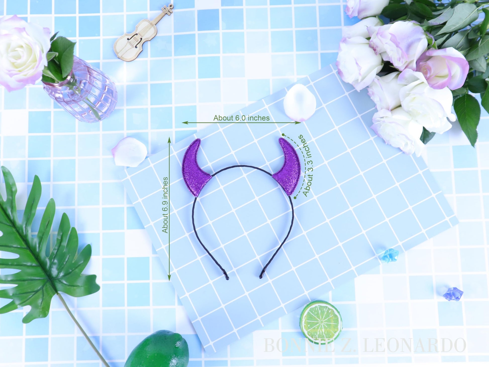 - Q: What is the size range for the Bonnie Z. Leonardo Glitter Devil Horns Headband? A: The headband is designed to fit both children and adults, featuring a flexible design with good elasticity.