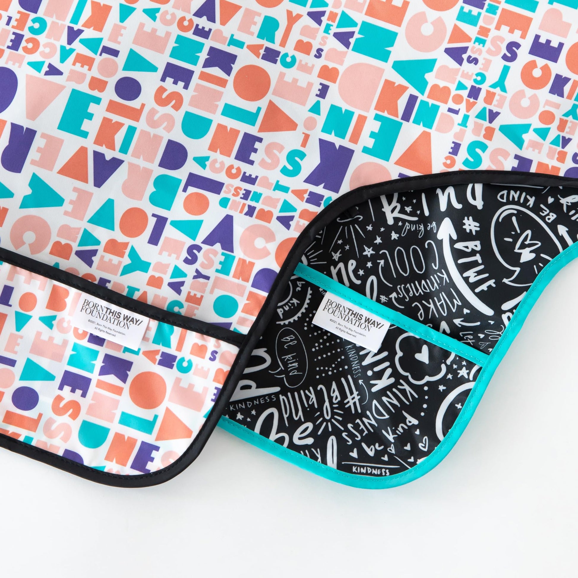 Wrap your messy eater in messages of kindness in the Born This Way Foundation by Bumkins bib. Generously sized and ideal for baby-led weaning, the Sleeved Baby Bib is made from Bumkins lightweight, durable, waterproof fabric. With only one layer of fabric, you dont need to worry about icky stuff growing between layers. A large catch-all pocket helps contain spills and crumbs. Wipeable and machine washable, this bib is easy to clean so that you can use it over and over again! We use third party labs to ensure the products we manufacture comply with CPSC and CPSIA standards for BPA, Lead, and Phthalates. Sized to fit ages 6 to 24 months. Adjust fit with back tie closure and adjust sleeve length with the elasticized cuff. Measures approximately 14 across the chest, 13 from neck down and 32 from cuff to cuff. Designed in Arizona, responsibly made in China.Born This Way Foundation by Bumkins is a partnership with the goal of promoting kindness and mental health awareness. A portion of each purchase supports Lady Gagas non-profit Born This Way Foundations mission of supporting youth mental health and working with them to build a kinder, braver world. Together, we can make kindness cool, validate the emotions of young people, and eliminate the stigma surrounding mental health.
