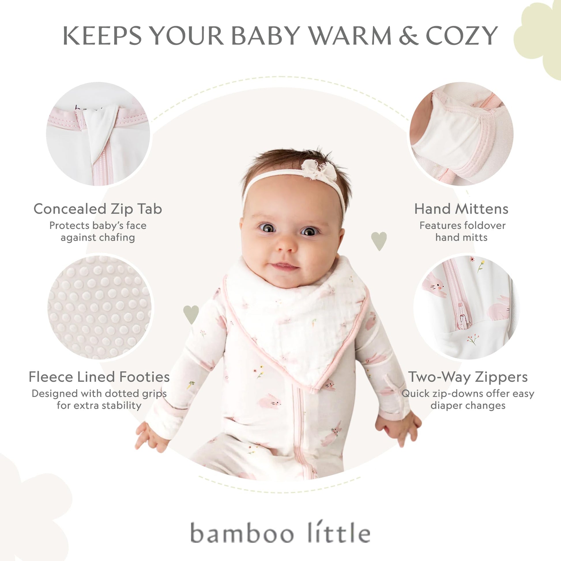 - Q: What features make these footies comfortable for my baby? A: The footies feature ultra-soft fleece-lined feet, a concealed zip tab at the neckline, and are made from soft bamboo jersey for all-over comfort.