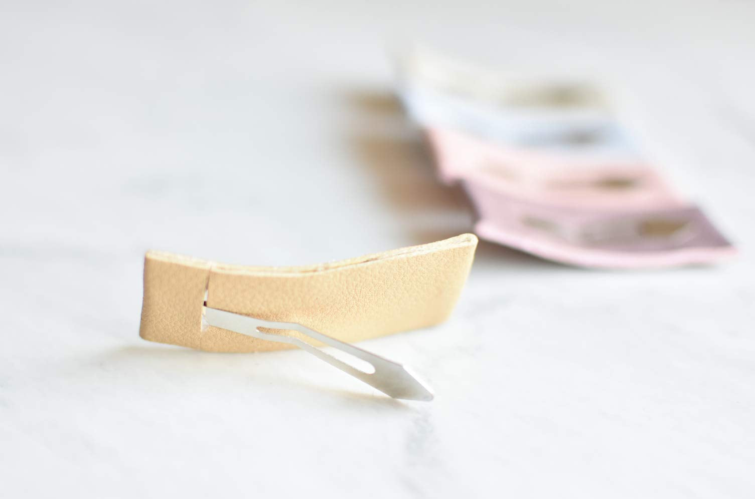 - Q: What materials are the hair snaps made from? A: The hair snaps are made from faux leather.