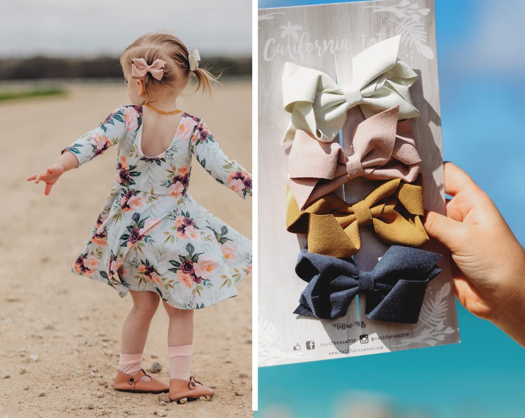 - Q: What is included in the California Tot Set of 4 Faux Suede Bow Clips? A: The set includes four premium faux suede bows, each measuring approximately 2.8 to 3 inches.