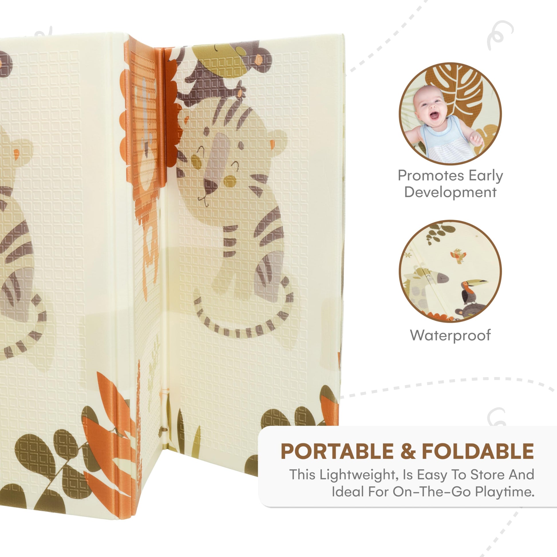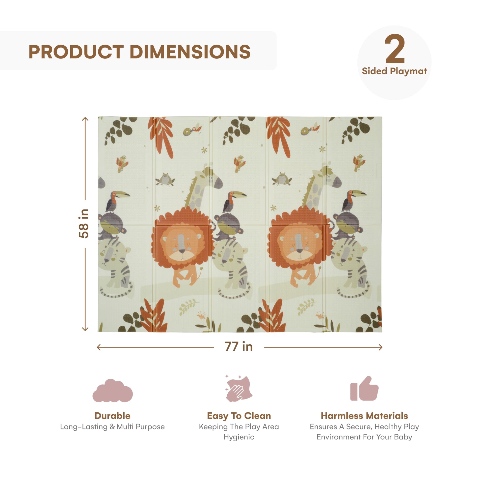 - Q: Is the play mat reversible? A: Yes, the play mat features a reversible design with two sides: one with a Safari theme and the other with Tropical Leaves, allowing for style versatility.