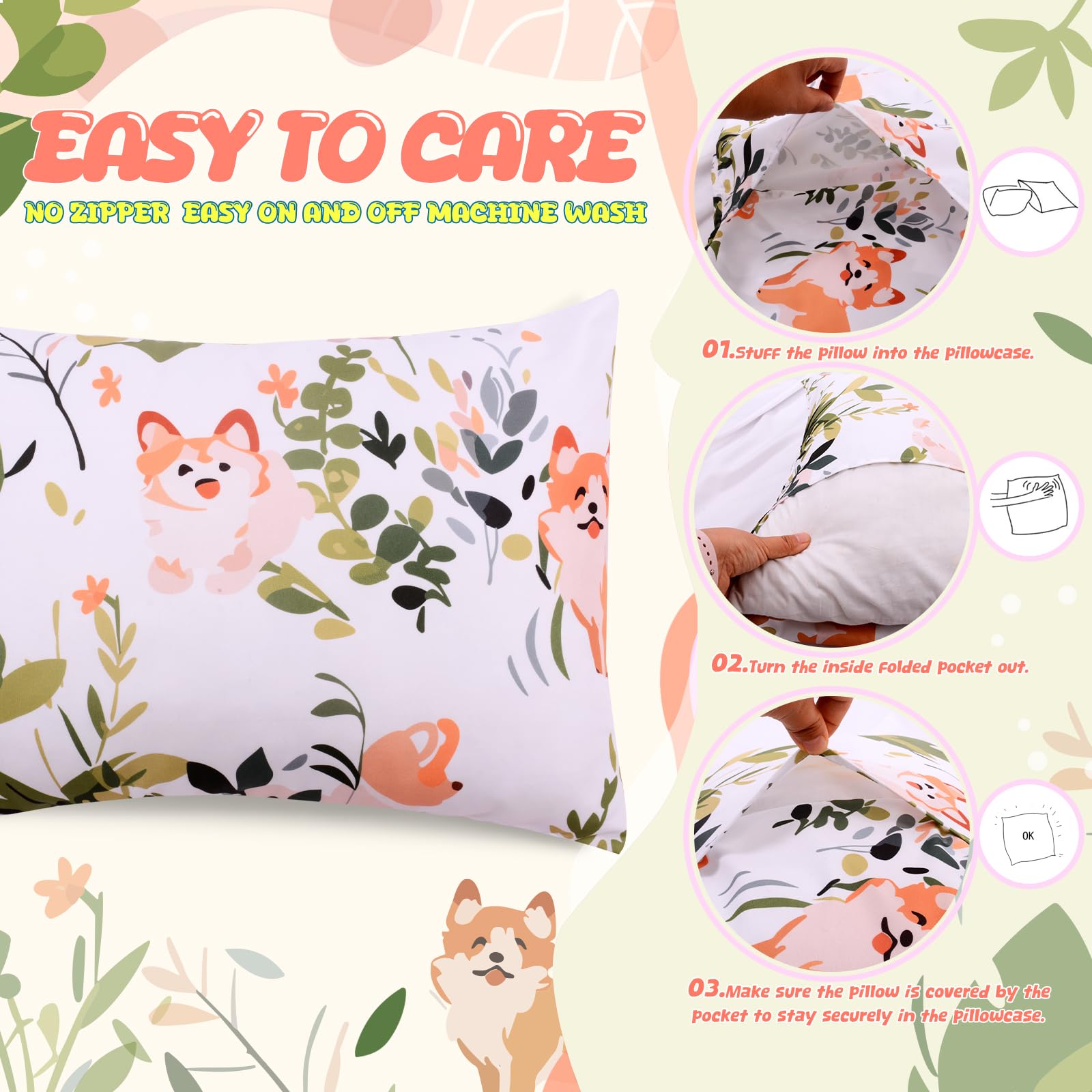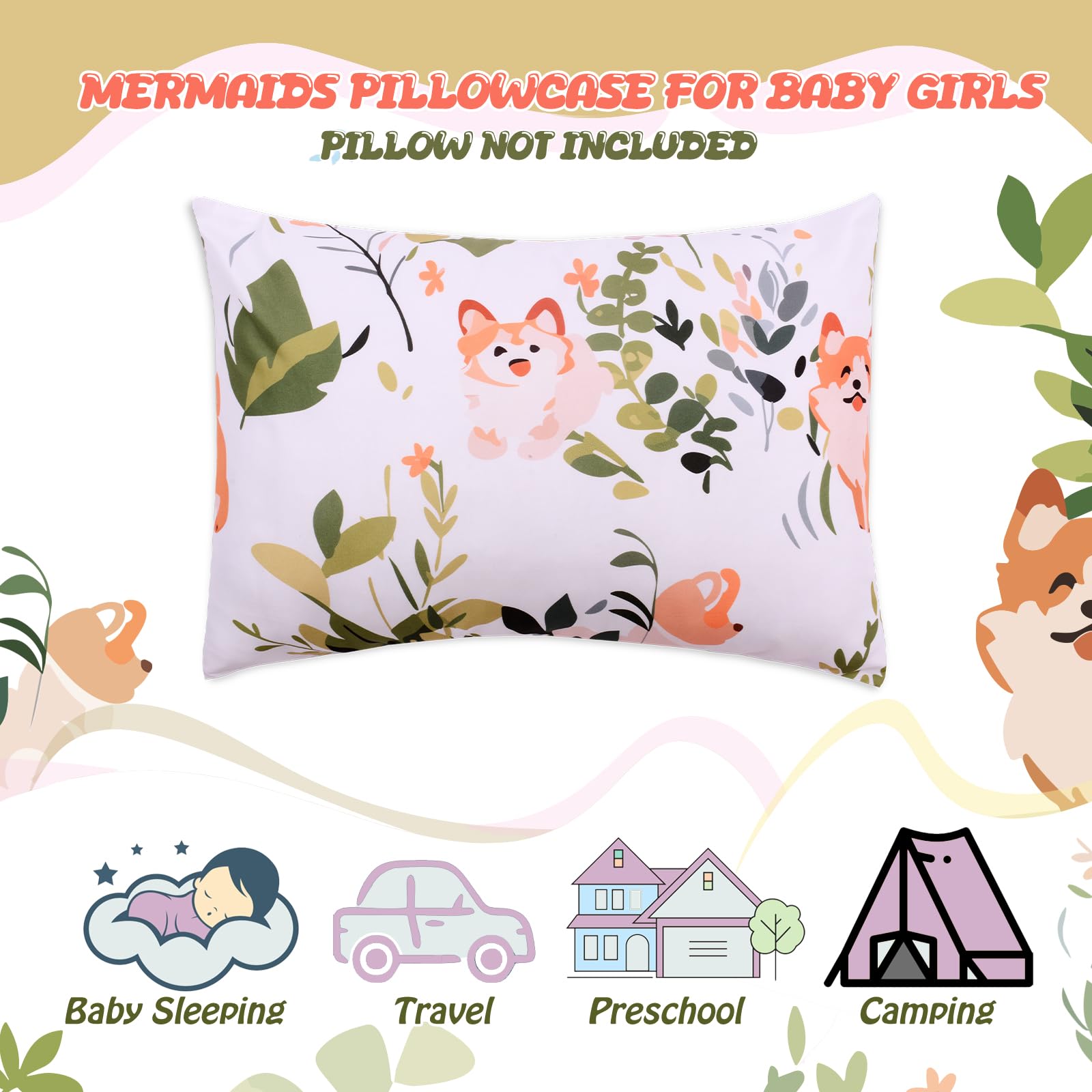 ?SOFT MATERIAL?Our product is made by nice quality polyester,that healthy and breathable lightweight fabric makes a gentle touch,very safe and comfortable for babies'delicate skin,comfortable and breathable.It's not easy to pilling. | ?PERFECT SIZE?(PILLOWS ARE NOT INCLUDED)Perfect fits 13x18 or 12x16 standard size toddler and travel pillows,neck pillow, baby pillow or any small pillow. Great for night sleep,nap,camping,hiking and travel. | ?ENVELOPE CLOSURE DESIGN?The back of the pillowcase adopts an envelope design without a zipper.That means your child won't be hurt.And the pillow won't fall out anyway and easily to put in or take out pillow. | ?UNIQUE DESIGN?Using a combination of puppies and greenery, the dog playing in a patch of greenery can make people feel relaxed and calm. Perfect for little ones and also for your family pets.A must-have for parents looking for a soft and breathable option for their child's bedding collection. | ?WASHING CARE INSTRUCTIONS?Toddler pillowcases are machine washable and hand washable,gentle cycle,tumble dry low temperature for best results,cool iron if needed.Do not bleach.The ideal choice for parents looking for a safe and high-quality pillowcase for their little one.