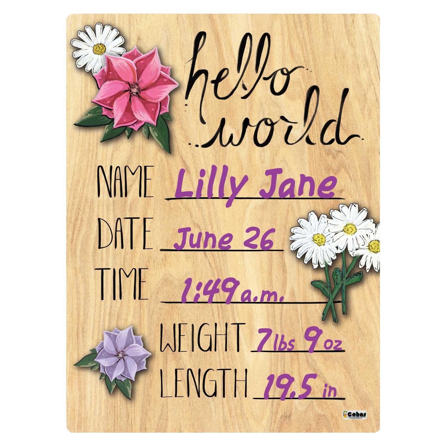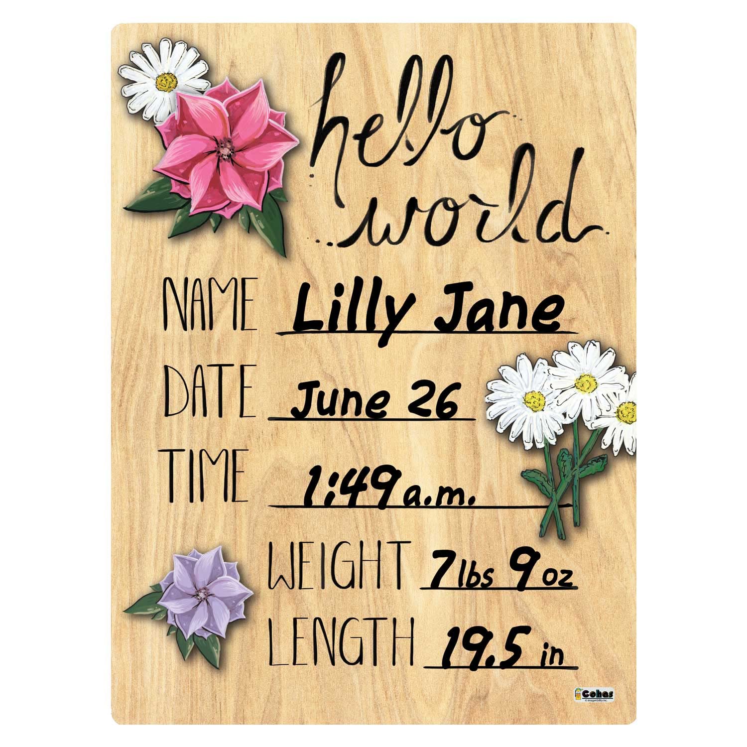 - Q: What are the dimensions of the Cohas Hello World Newborn Baby Announcement Board? A: The board measures 9 by 12 inches and is 0.13 inches thick.