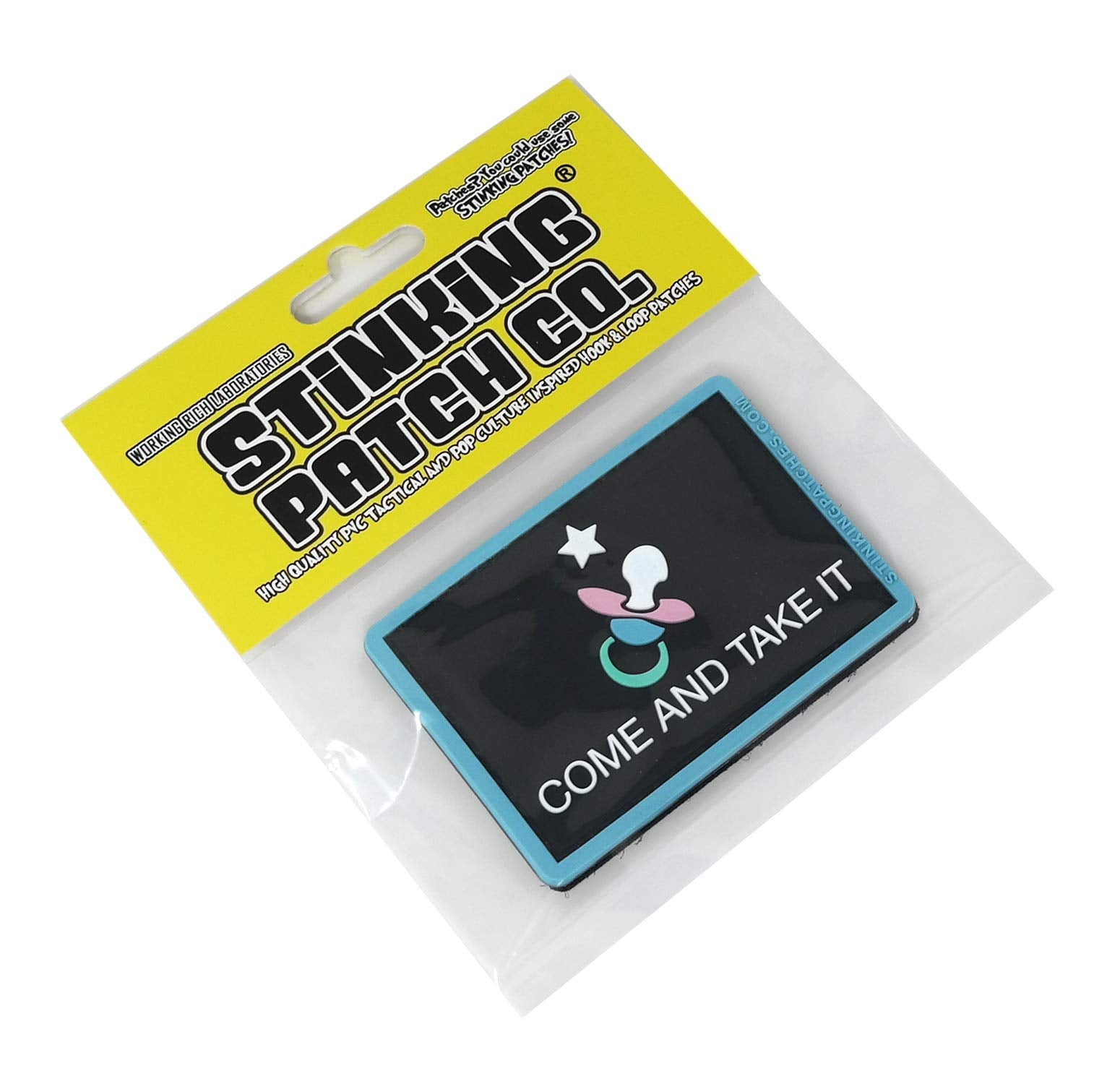 - Q: What is the design of the Come and Take It Pacifier Patch? A: The patch features a hilarious Come and Take It pacifier design, which is both distinctive and colorful, making it a fun addition to your tactical diaper bag.
