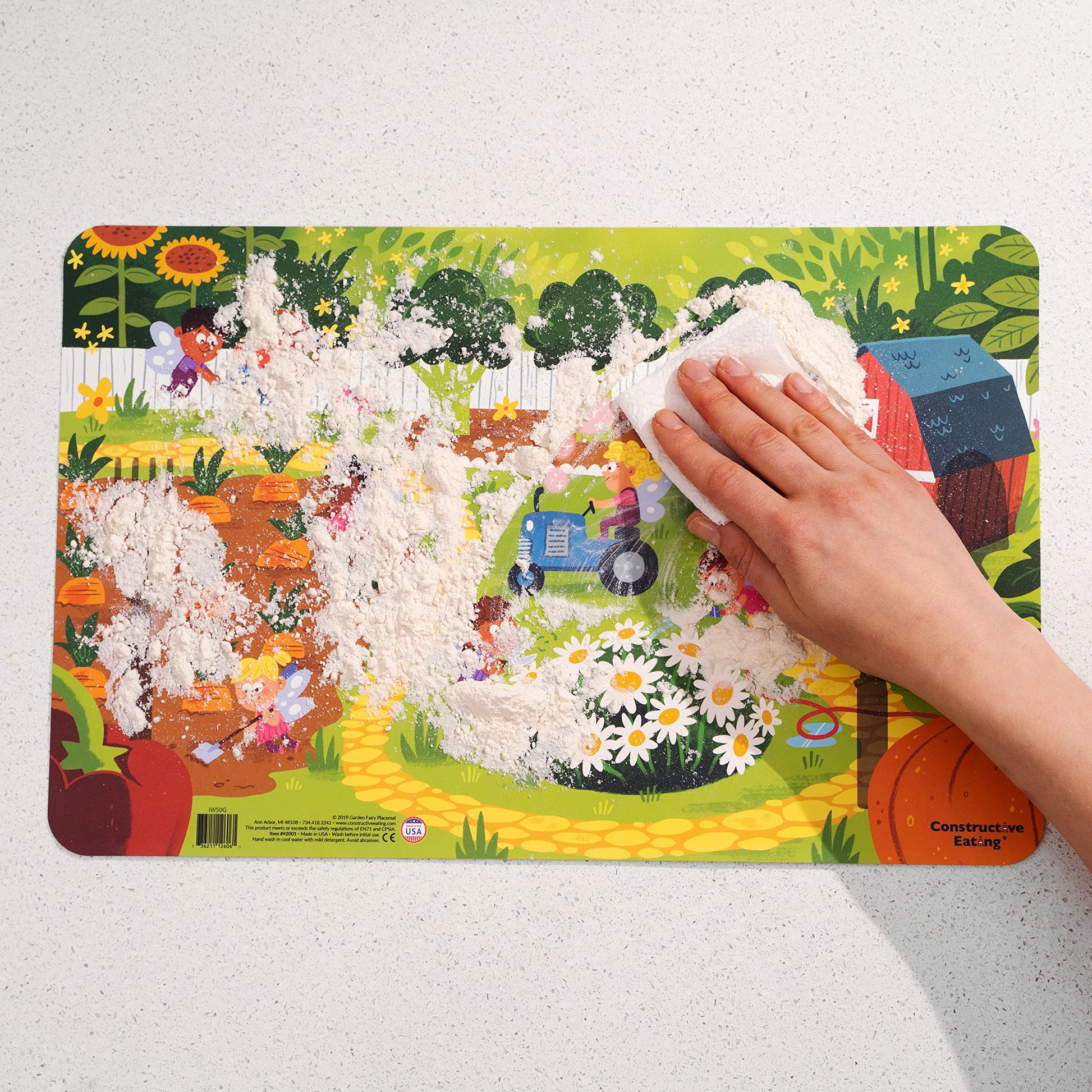 • Q: How does the placemat help with table setting skills? A: The placemat features shadowed outlines of each utensil, teaching children how to set the table correctly.