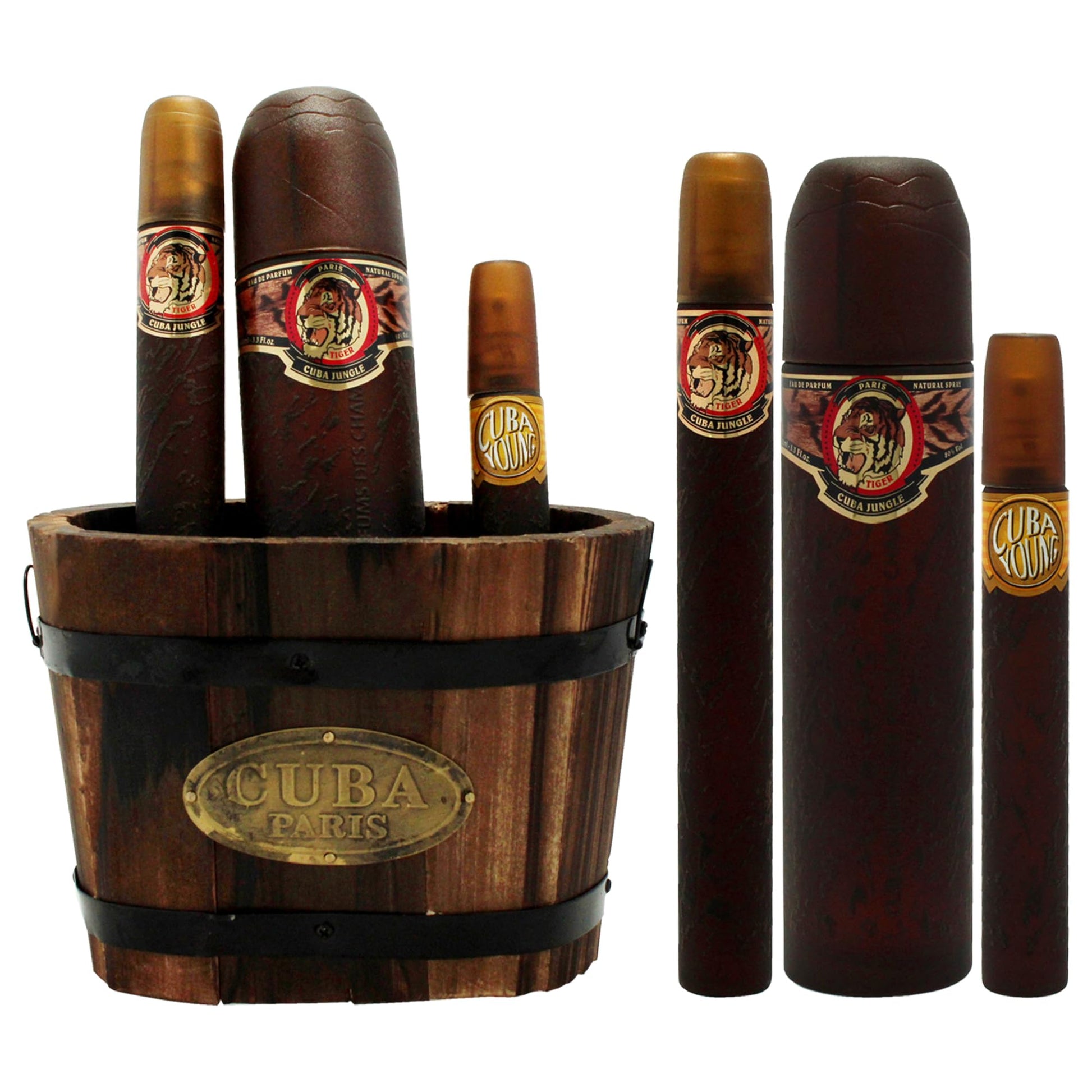 - Q: What does the Cuba Jungle Tiger gift set include? A: The gift set includes three pieces: a 3.3oz EDP spray, a 1.17oz EDP spray, and a 0.5oz EDP spray.
