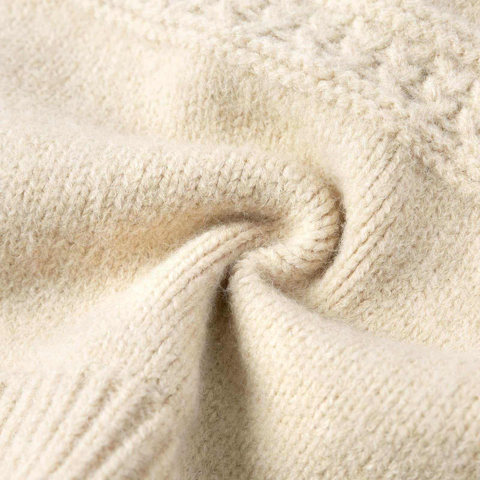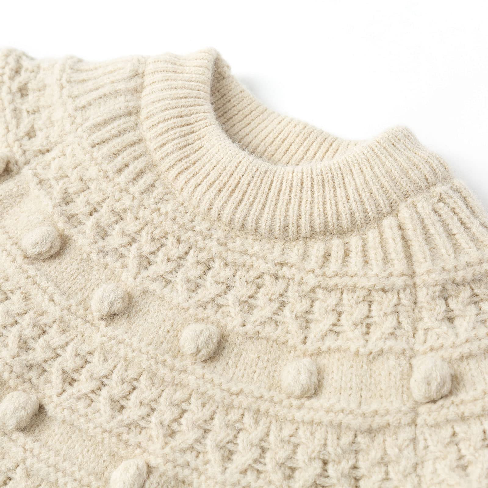 - Q: What design features does this sweater have? A: The sweater features a cable knitted design, rib stitch on the cuff and hem, and is decorated with handmade pompoms for added cuteness.