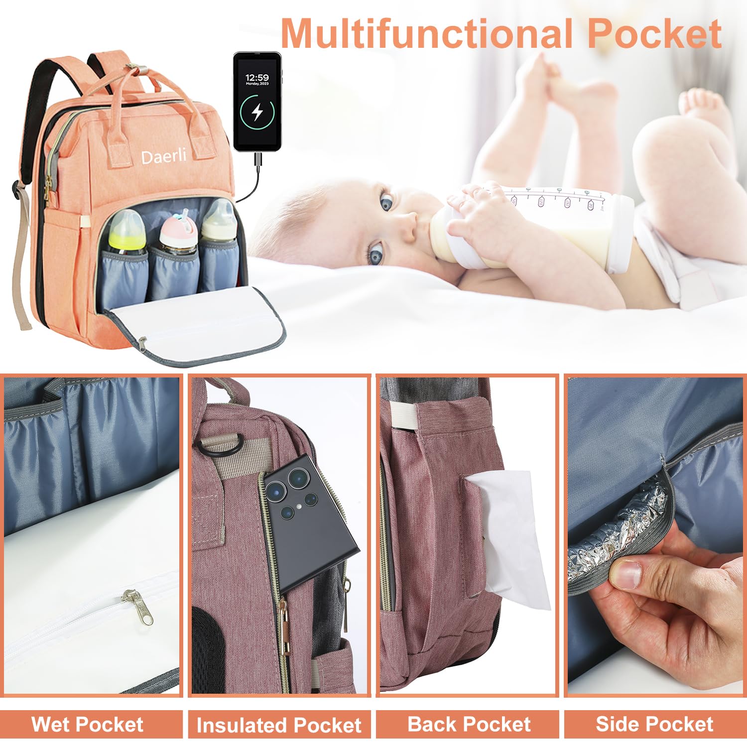 - Q: What features make the Daerli Diaper Bag with Changing Station unique? A: The Daerli Diaper Bag includes a built-in changing station with a soft mattress for baby comfort, a sunshade for protection from the sun, and 14 pockets for organization, including insulated pockets to keep baby bottles warm.