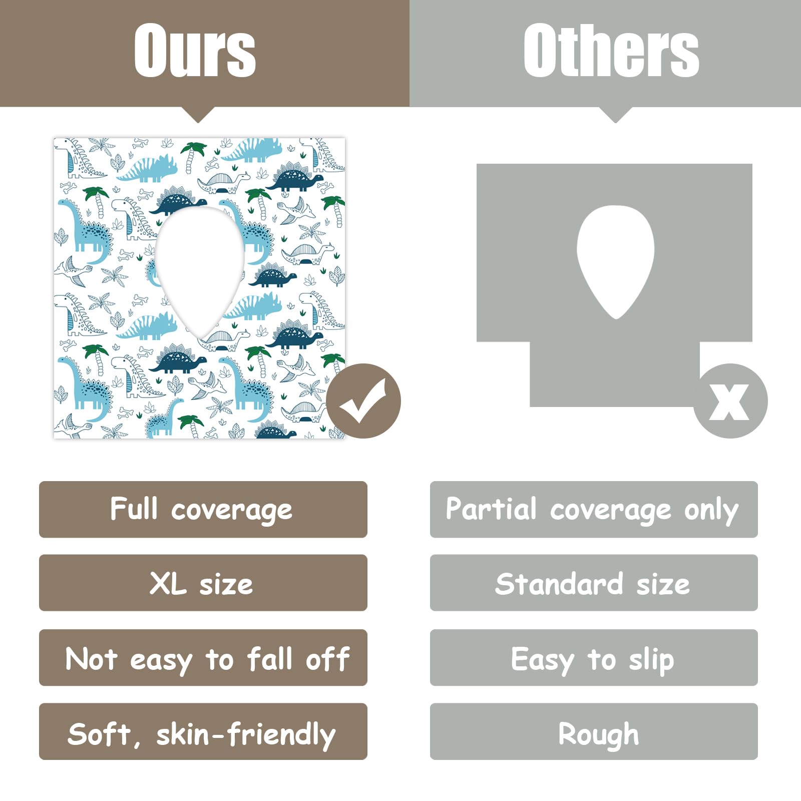 - Q: What is the design of the toilet seat covers? A: The covers feature a fun and engaging dinosaur pattern, which is appealing to both children and adults.