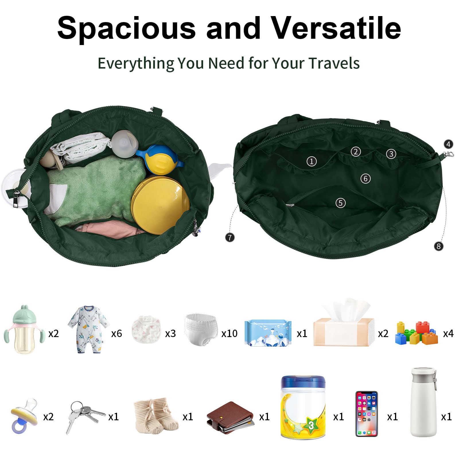 - Q: What are the carrying options available with this bag? A: The Diaper Bag Tote offers multiple carrying options: as a handbag, shoulder bag, or crossbody bag, along with adjustable stroller straps.
