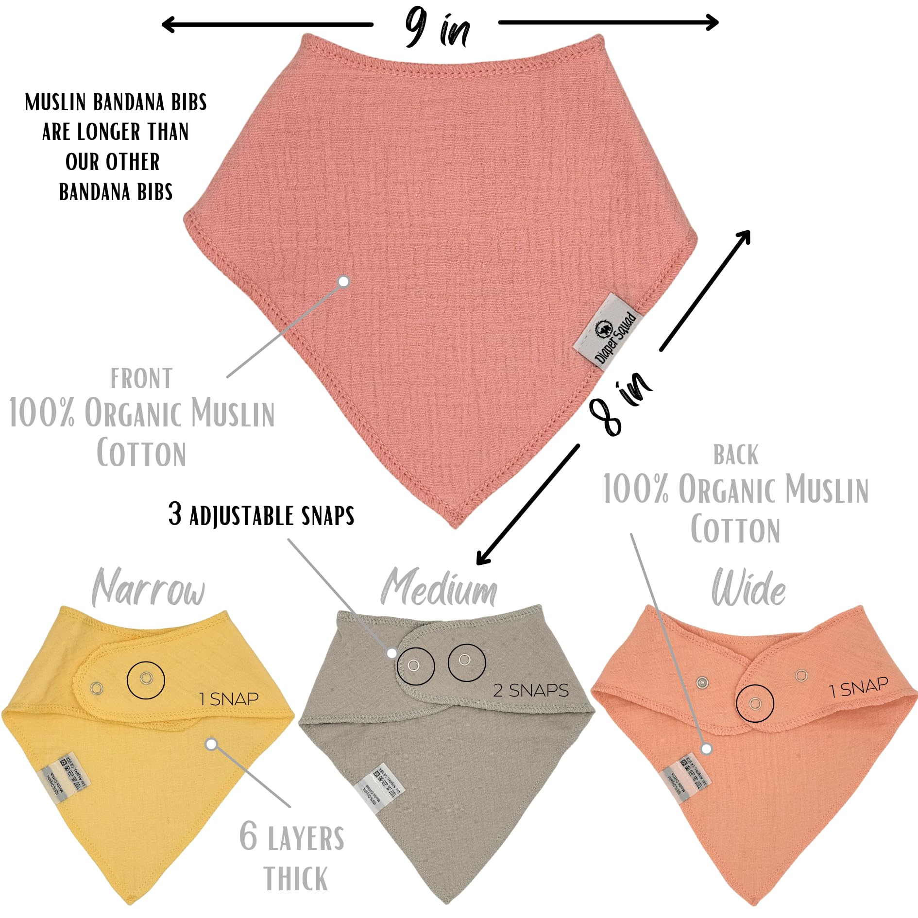 - Q: What are the dimensions of the DiaperSquad baby bibs? A: The dimensions of the DiaperSquad baby bibs are 8 inches by 9 inches.