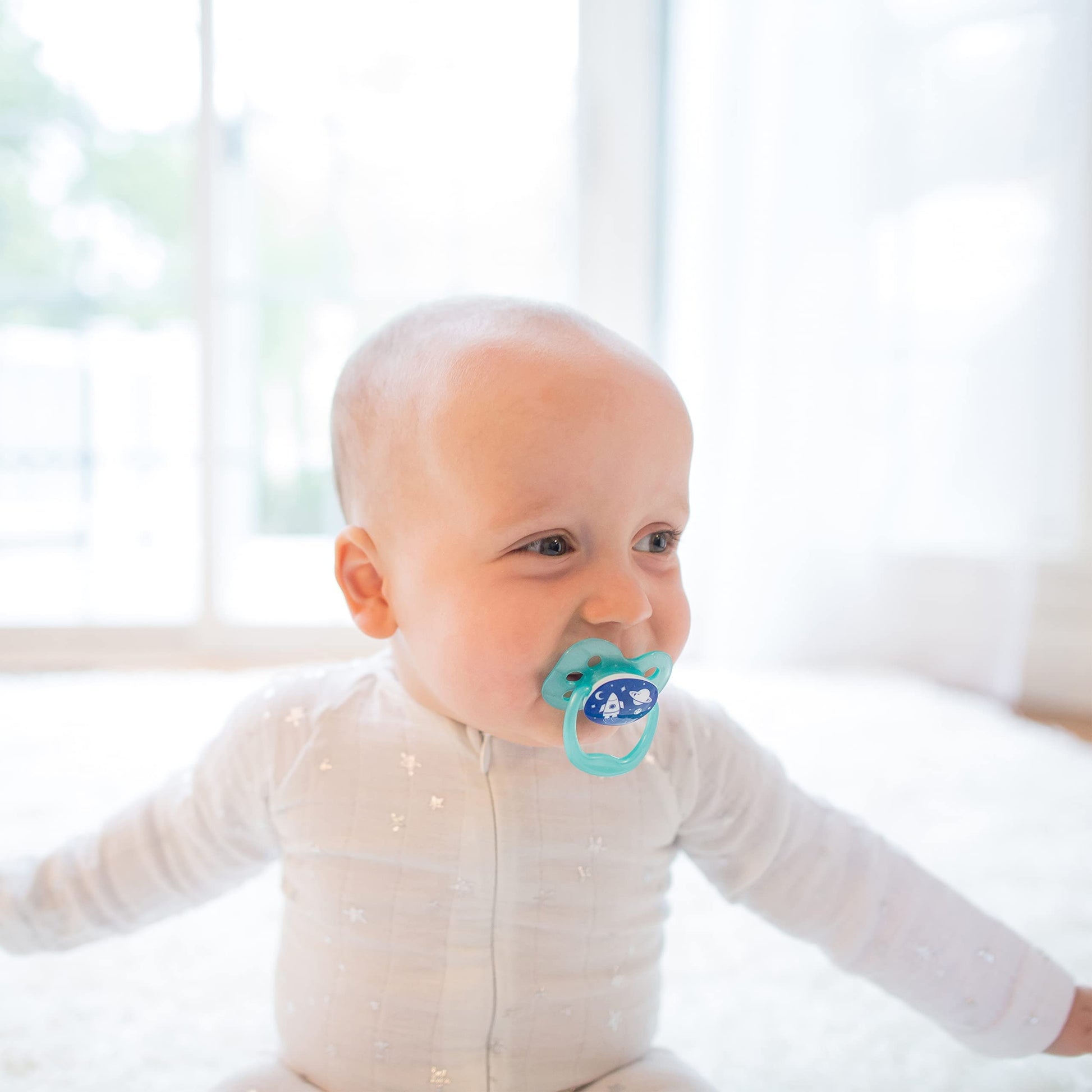 - Q: Is there a larger version of this pacifier for older babies? A: Yes, as your baby grows, you can transition to the 6-18 months stage, which features a slightly larger version of the same soothing design.