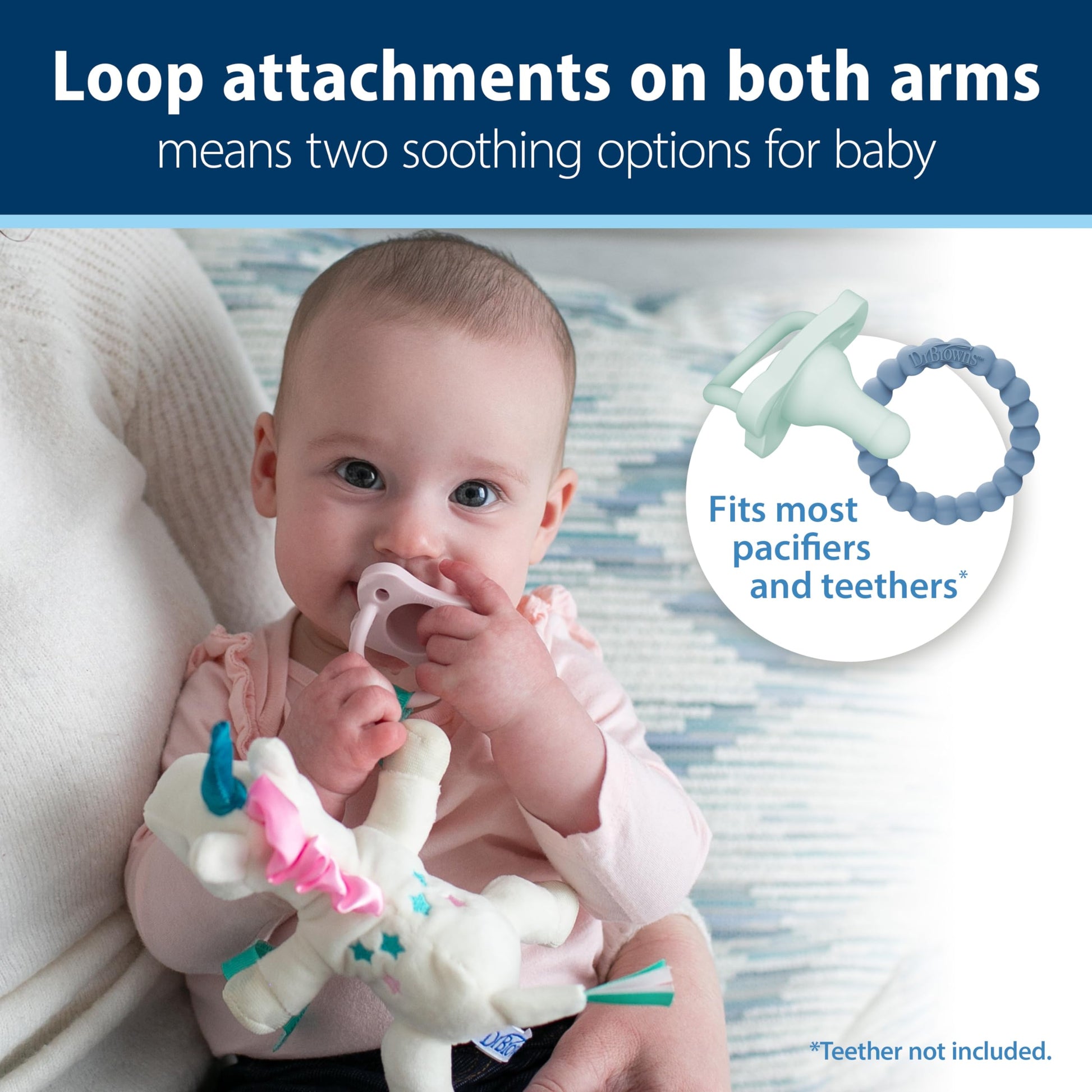 - Q: Does the Lovey have strong attachments for pacifiers and teethers? A: Yes, the Lovey has strong loop attachments with hook and loop closures to securely hold removable pacifiers and teethers.