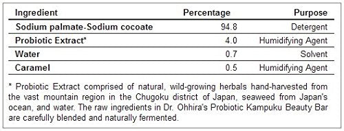 - Q: What are the main ingredients in Dr. Ohhira's Probiotic Kampuku Beauty Bar? A: The bar is crafted from 14 natural plant extracts, including wild-grown herbs and seaweed, blended with mountain spring water, Dr. Ohhira’s probiotics, and prebiotics.