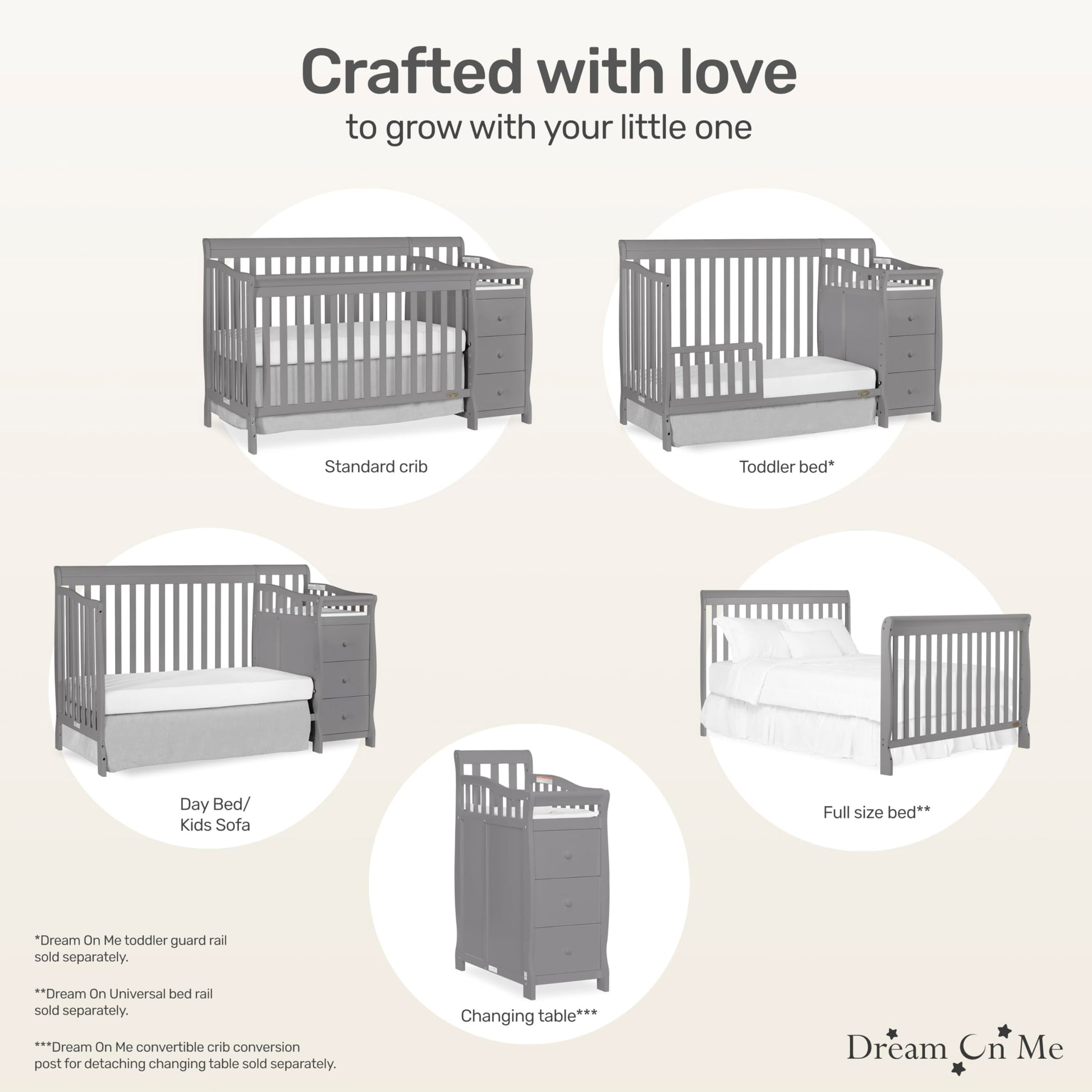 - Q: How does the crib convert into different bed types? A: The crib can be converted into a toddler bed, day bed, and full-size bed by using a conversion kit and bed rails, which are sold separately.