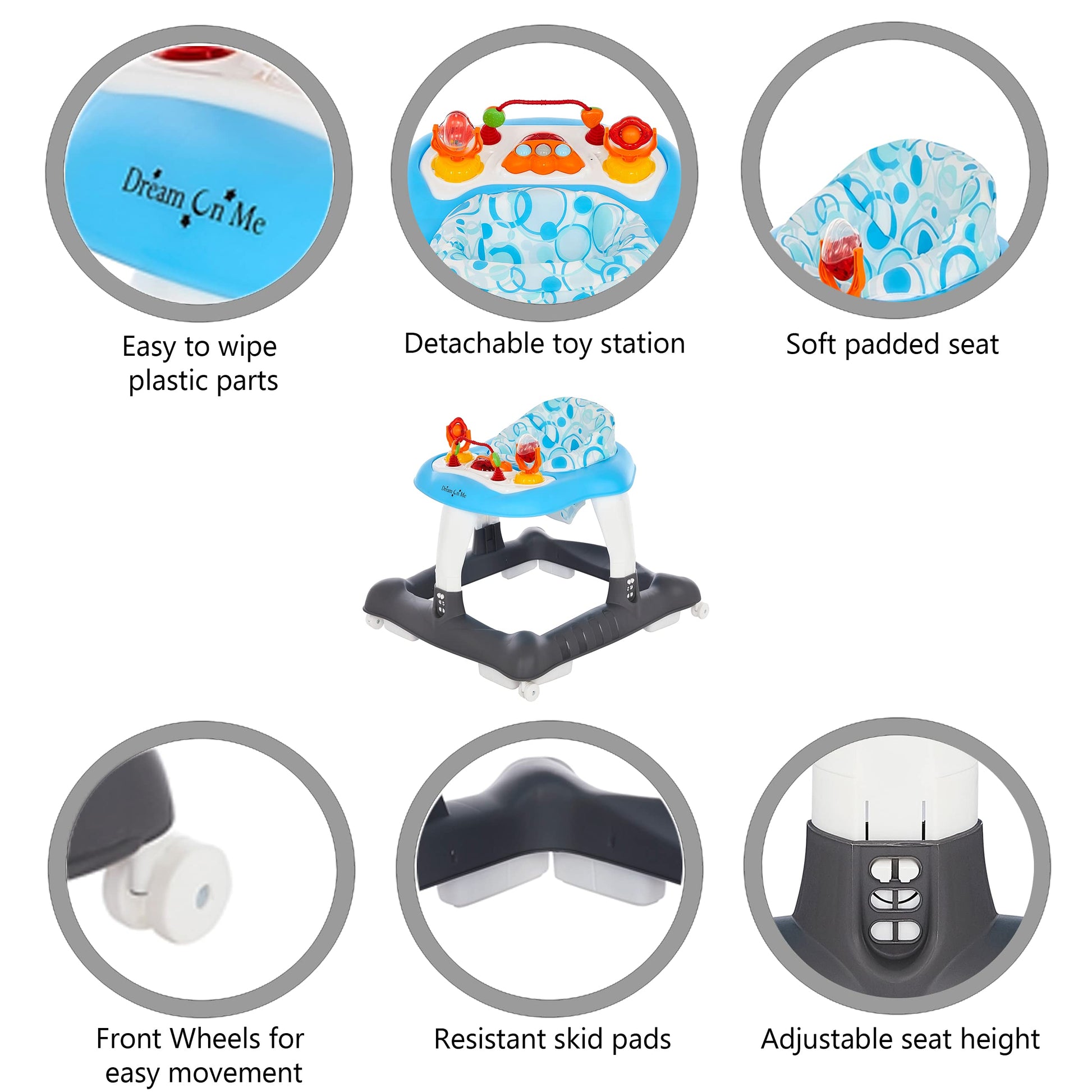 - Q: Does the walker have adjustable height settings? A: Yes, the Dream On Me Explorer Baby Walker features a 3-position height adjustment to accommodate your growing child.