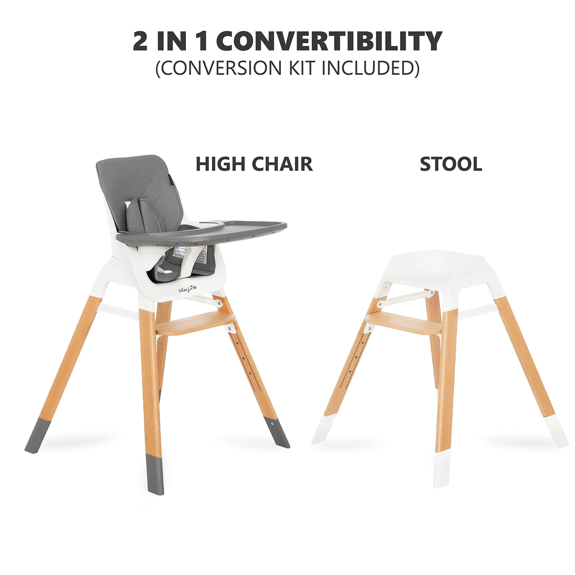 Happiness is watching your baby try their very first foods. Mealtime with babies is about more than just eating. Besides learning all sorts of social and cultural norms, it is some of their first active sensory play. Keeping all this in mind, Dream On Me parents have voiced their desires for a trendy, functional high chair and the result is our Nibble Beechwood Highchair. This multifunctional highchair is made from a sleek beechwood which is aesthetically pleasing, straight grained hard wood used in making furniture as well as hygienic food grade PP material. The comfy, padded seat is made of PU fabric, which is extremely durable, lightweight, and non-toxic. It offers a super-sized removable tray, adjustable 5-point safety harness and 4 position adjustable foot rest. Have your baby experience mealtime stress free, in comfort and with confidence. As an added bonus, the high chair can easily convert to a bar stool to use around the house for multiple functions. The highchair meets or exceeds the newest ASTM F 833 18 standards.
