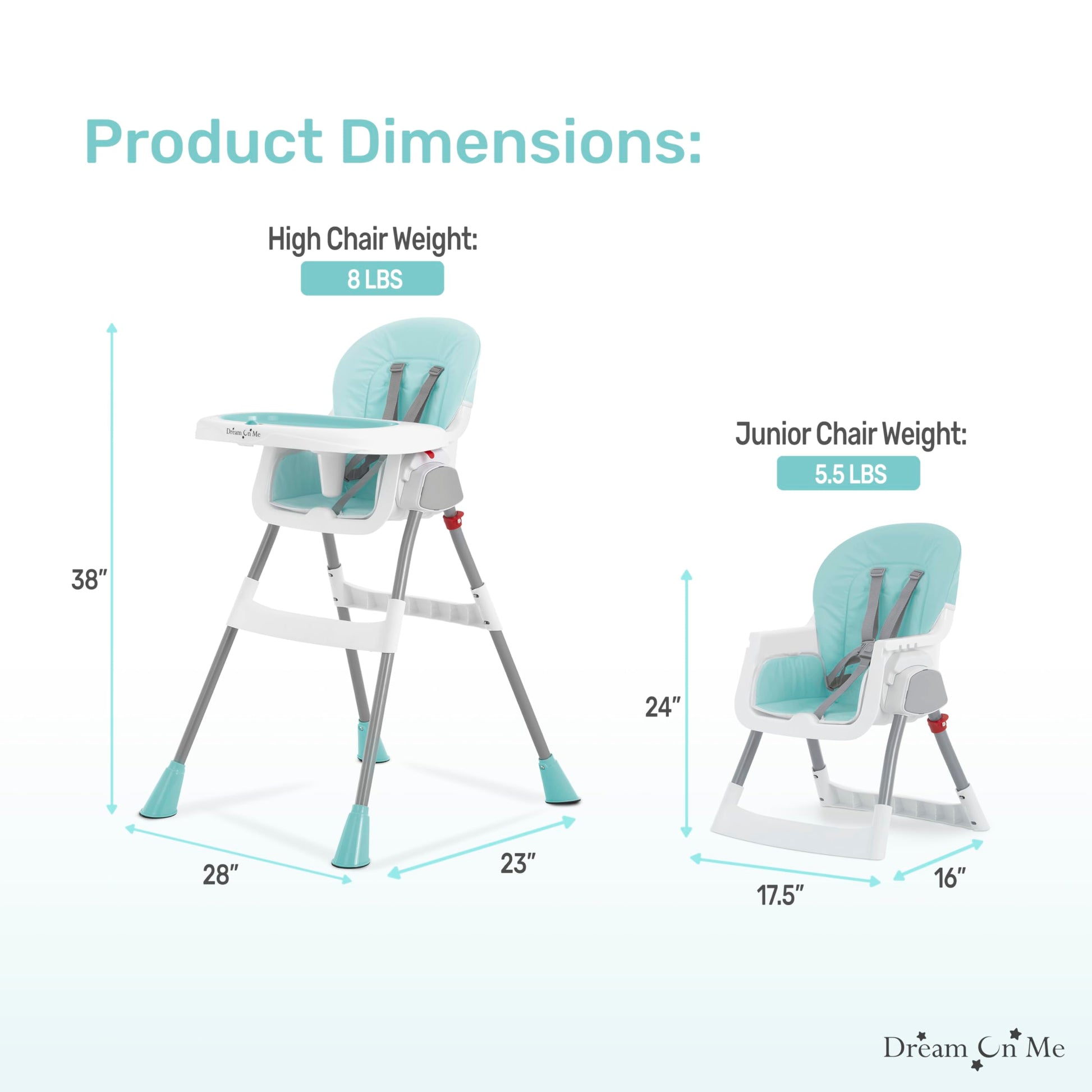 - Q: What are the dimensions of the Dream On Me Portable 2-in-1 Tabletalk High Chair? A: The dimensions of the high chair are 28 inches high, 23 inches wide, and 38 inches deep. The junior chair measures 17.5 inches high, 16 inches wide, and 24 inches deep.