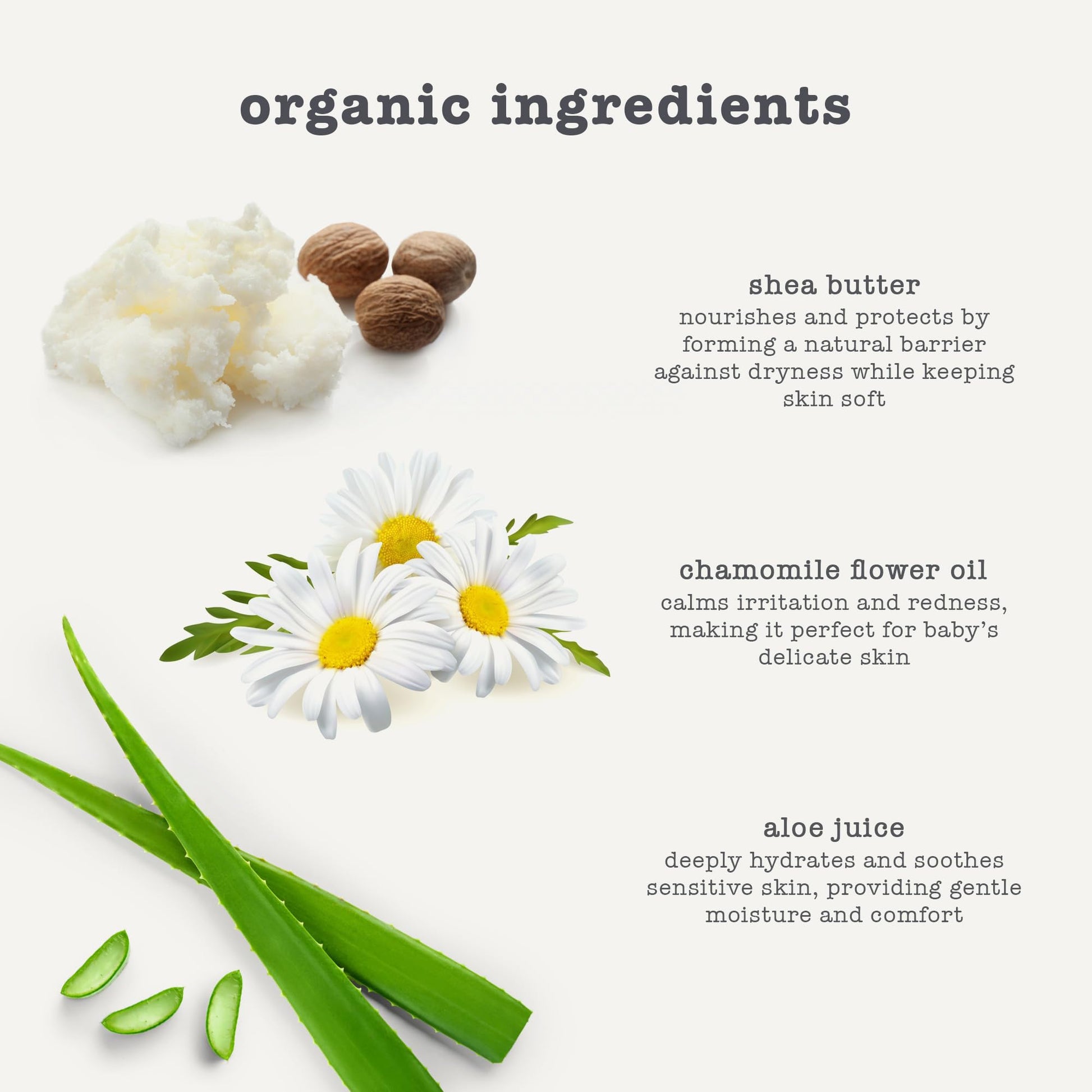 - Q: What are the main ingredients in erbaviva Organic Baby Lotion? A: The main ingredients include a nourishing blend of aloe juice, jojoba oil, and shea butter, along with essential oils like sweet mandarin peel and calming chamomile.