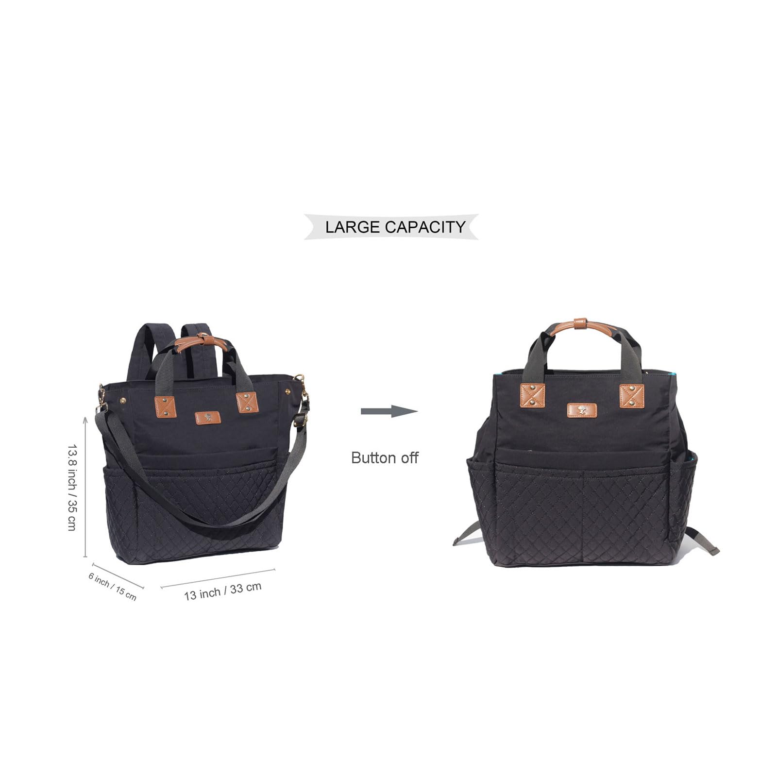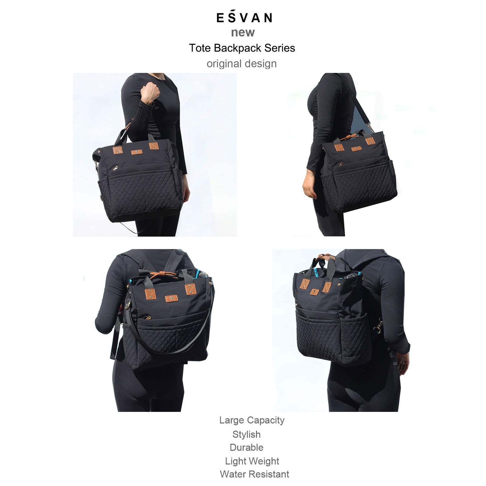 - Q: Can the ESVAN Diaper Tote Bag be used as a backpack? A: Yes, the ESVAN Diaper Tote Bag can be converted from a tote to a backpack by storing the shoulder straps in the back pocket.
