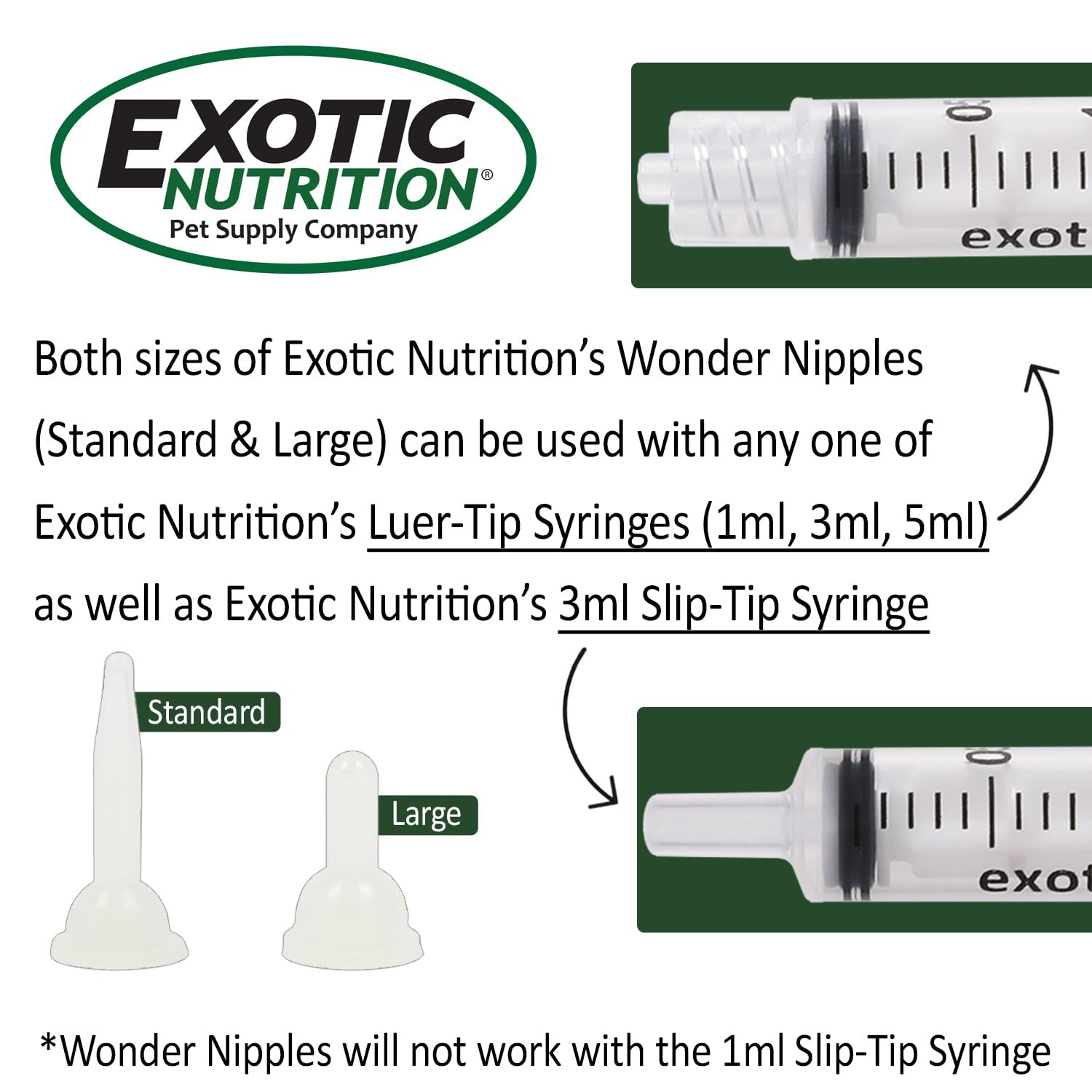 - Q: What is included in the Exotic Nutrition Baby Squirrel Nursing Set? A: The set includes Specialty Milk Replacer (280 grams), one 3 mL syringe, two 1 mL syringes, two regular-sized Wonder Nipples, and one large Wonder Nipple.