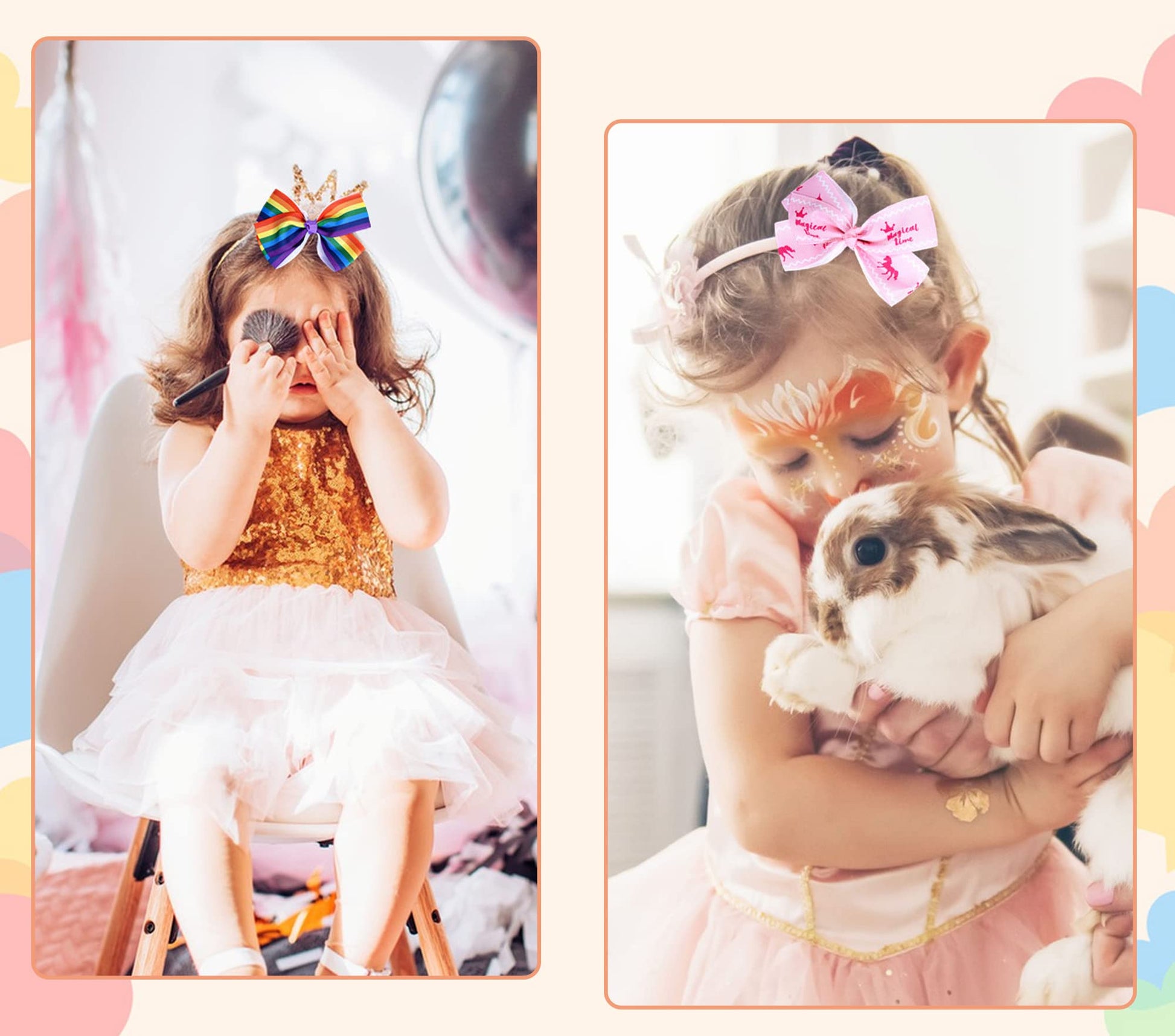 - Q: What types of patterns and colors are available? A: The hair bows come in multiple colors and patterns, including rainbow, donuts, hearts, and solid colors like yellow, red, pink, and purple.
