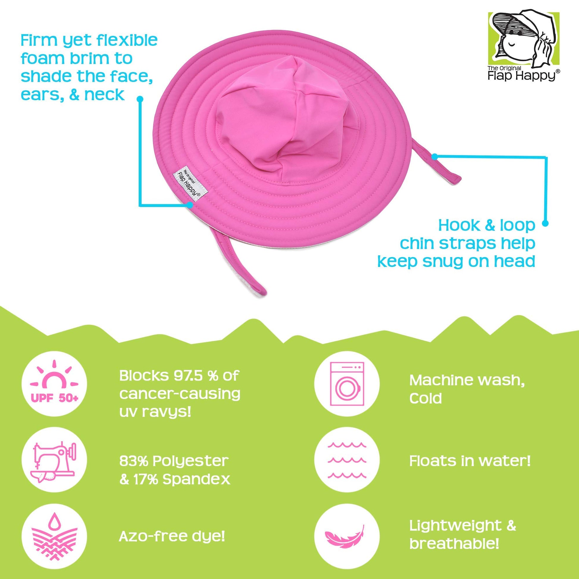 - Q: What is the UPF rating of the Flap Happy summer swim hat? A: The Flap Happy summer swim hat has a UPF 50+ rating, which blocks over 97.5% of harmful UV rays.