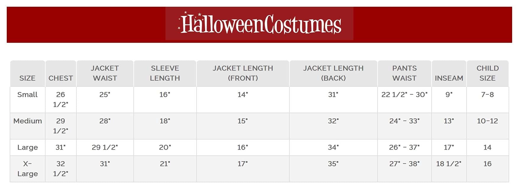 - Q: What sizes are available for the Lumiere costume? A: The Lumiere costume is available in sizes Small, Medium, Large, Extra Large, and Child Size 7-8 to 16. Please refer to the size chart for specific measurements.