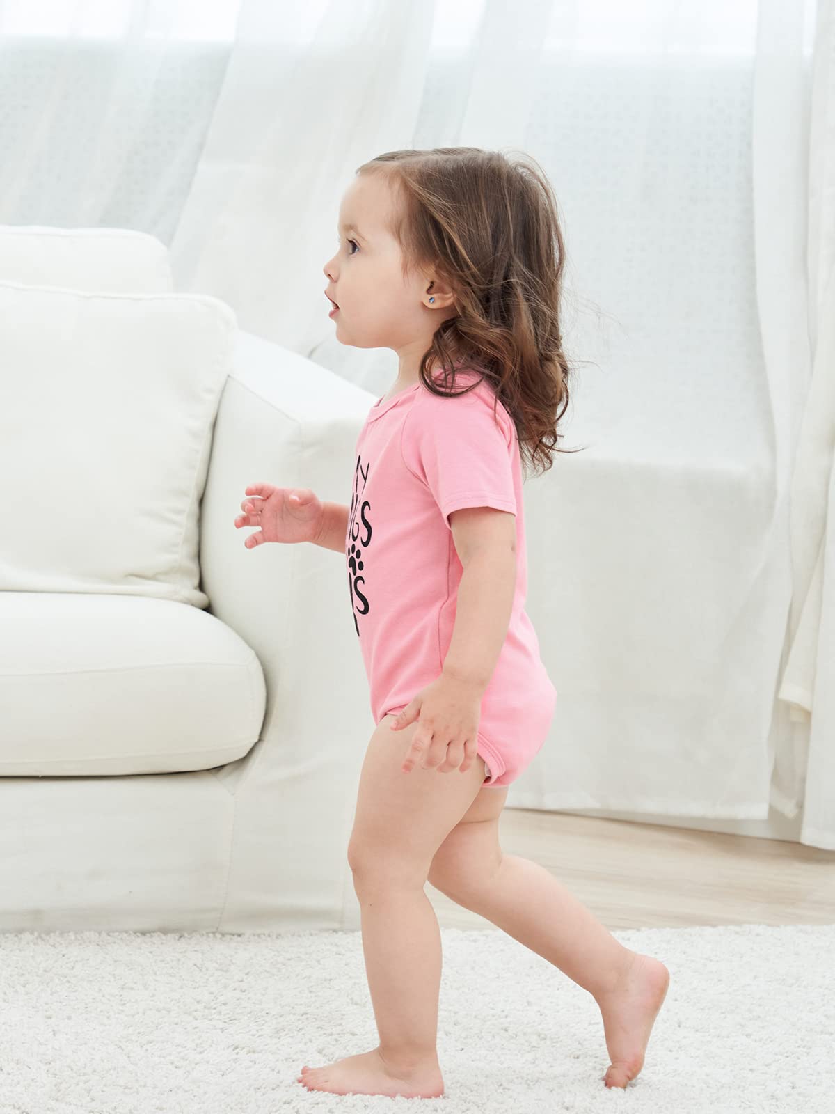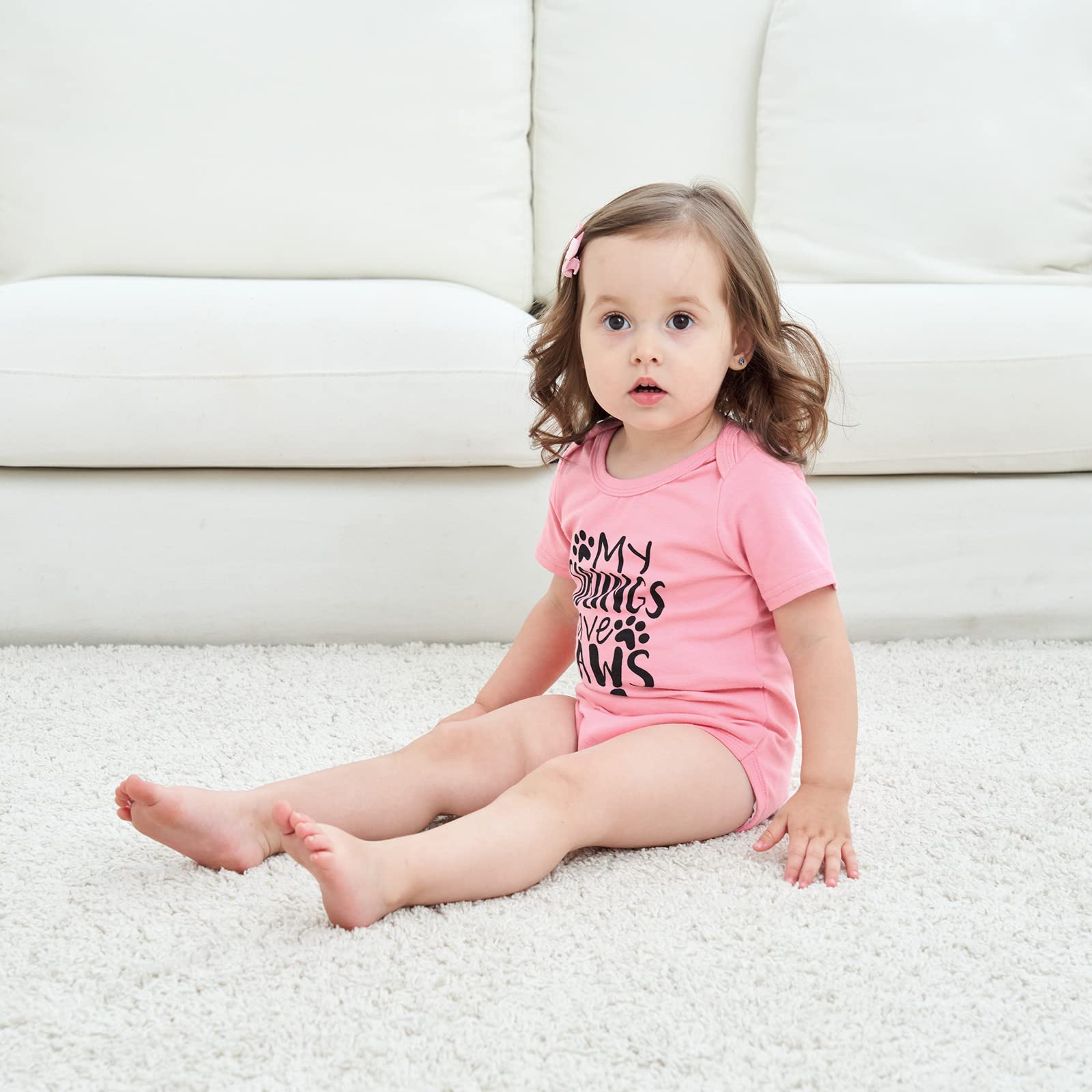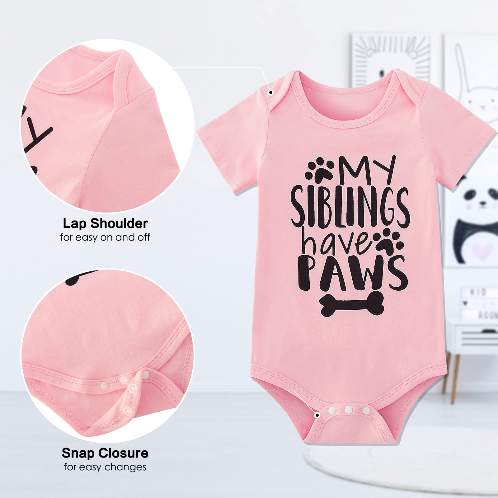 - Q: What design is printed on the bodysuit? A: The bodysuit features cute and funny letters, including the phrase 'My siblings have paws'.