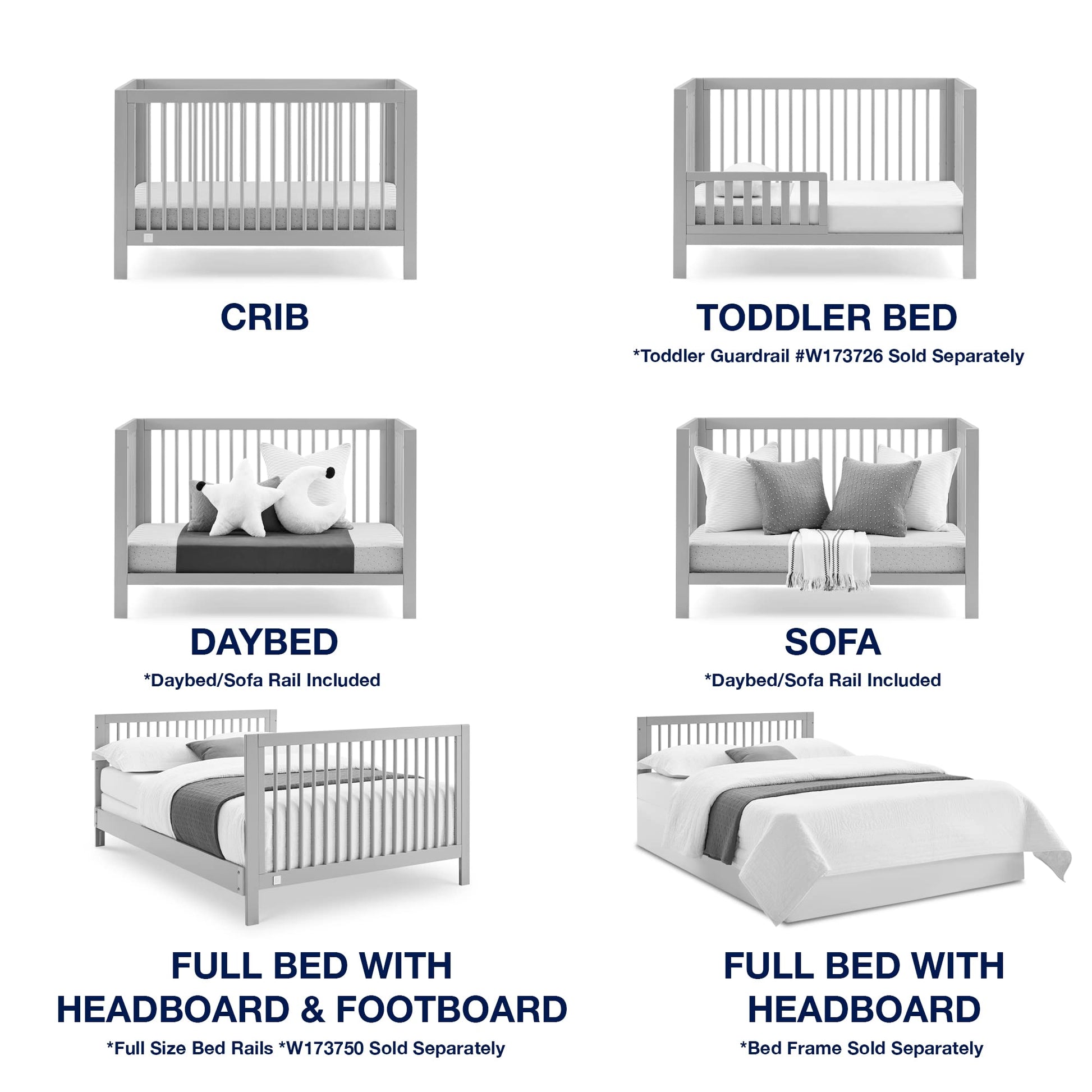 - Q: What additional items are needed to convert the crib to a full-size bed? A: To convert the crib to a full-size bed, you will need to purchase conversion rails separately, specifically model numbers W173726 for the toddler guardrail and W173750 for the full-size bed rails.