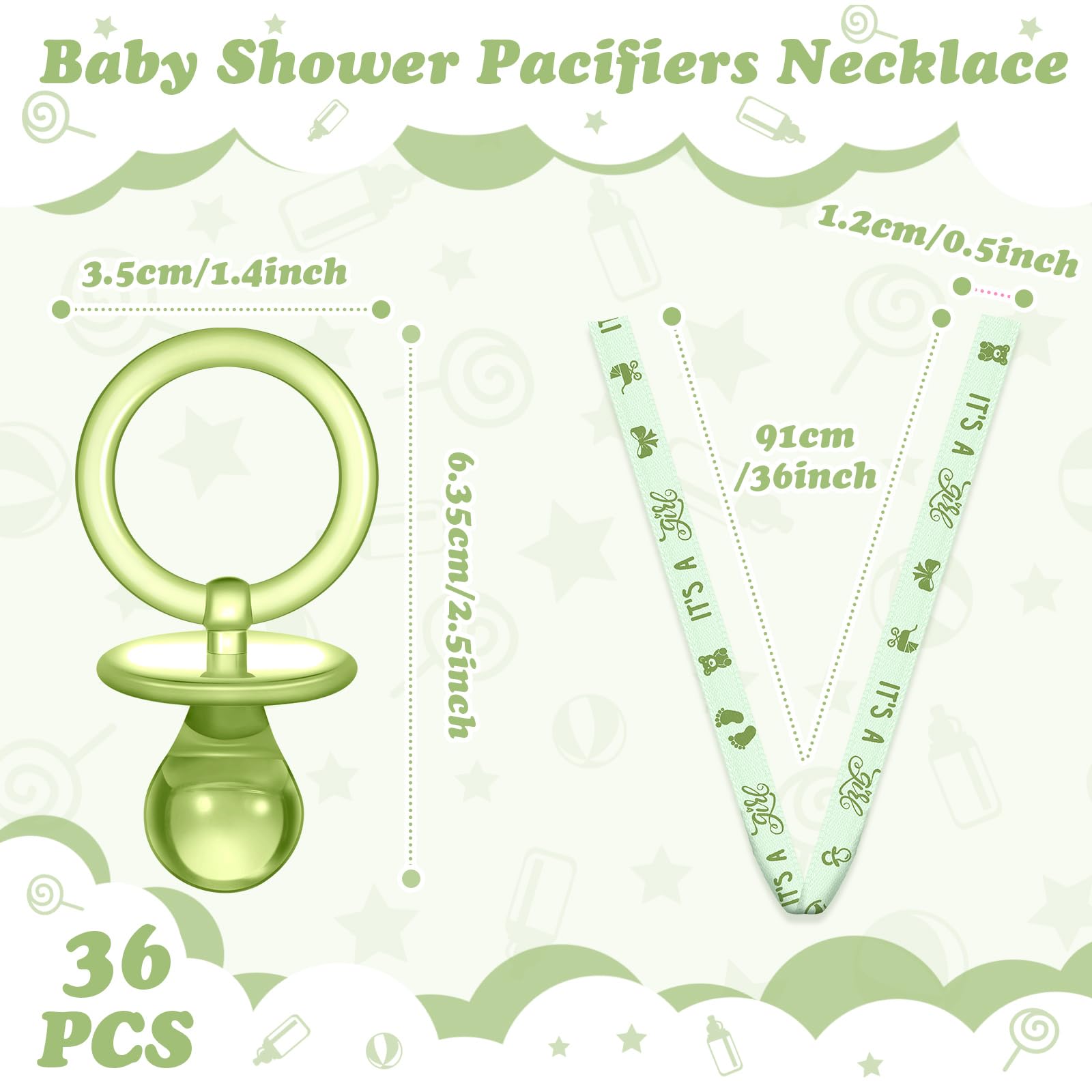 - Q: How many pacifier necklaces are included in the package? A: The package includes a total of 36 pacifier necklaces, making it ample for decorations or party favors.