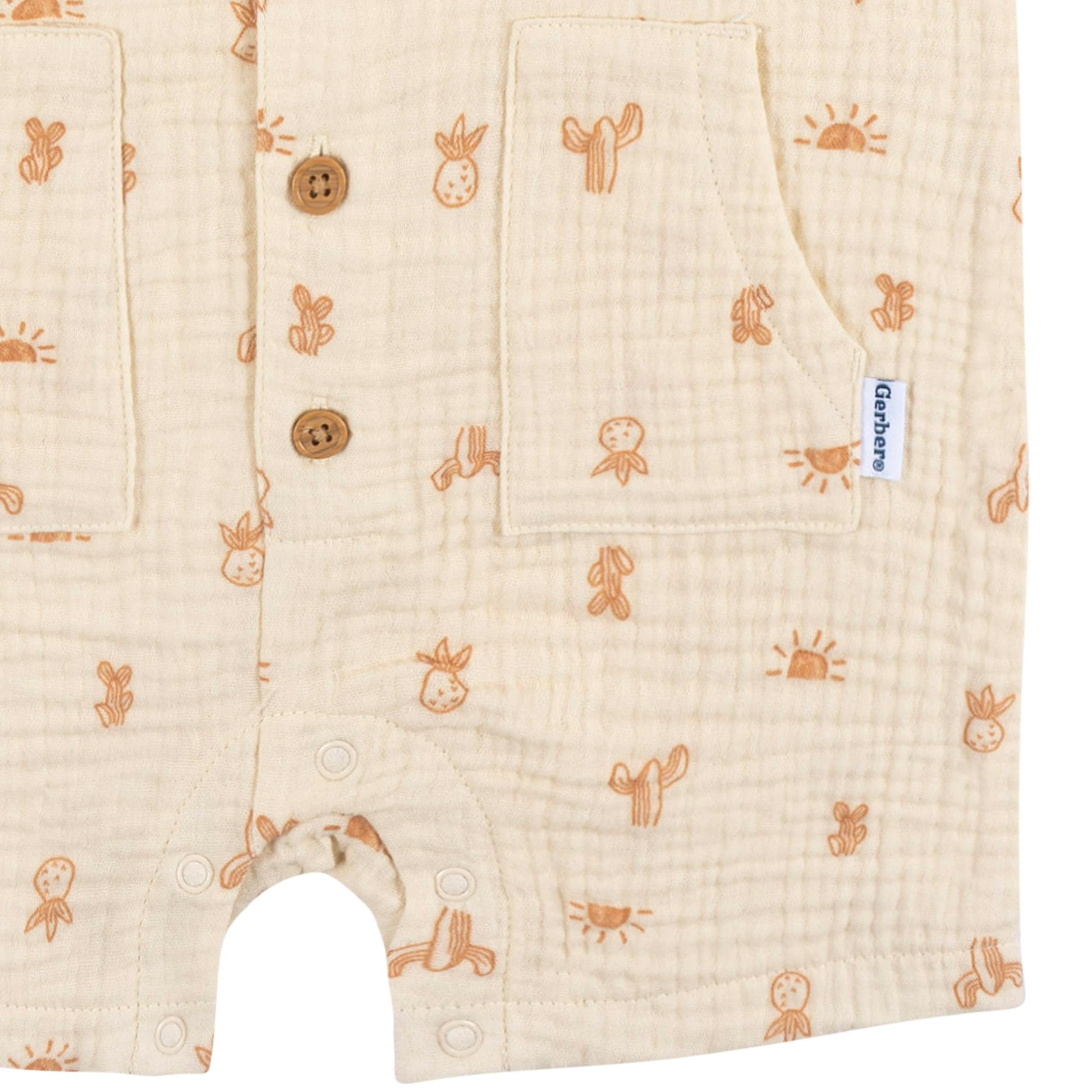 - Q: What color is the romper? A: The romper features a light brown color with a desert theme print.